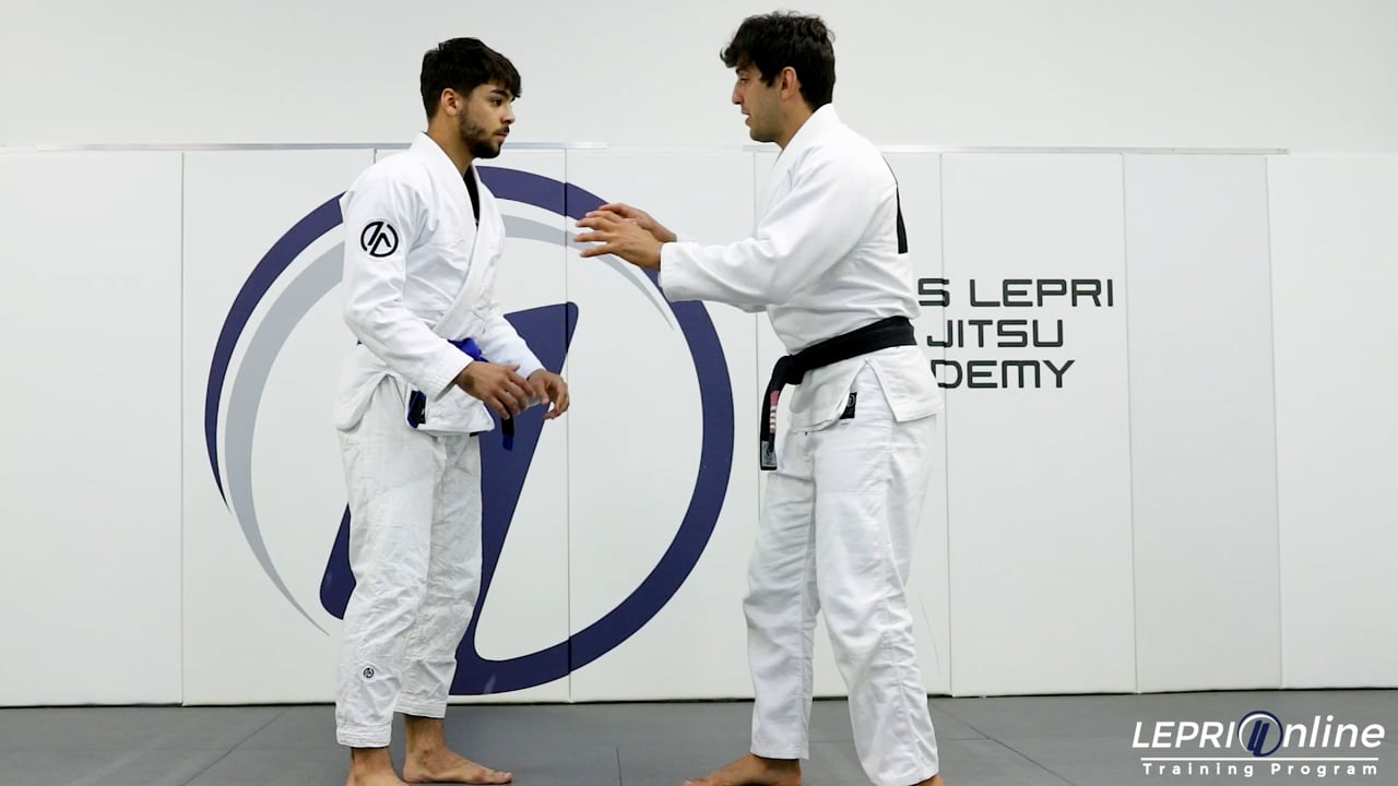 Professor Lucas Lepri teaches how to get the mount or collar choke, after pulling to the closed guard. Lucas and the opponent both start with collar and sleeve controls. Lucas releases the grip on the sleeve so he can use that hand to break the opponent's grip on the collar. Lucas grips underneath the arm and while still maintaining the grip, he pulls the opponent's arm across over his own chest. The other hand is used to reach behind the opponent's back to grab the belt. From here, Lucas steps closer to the opponent so he can place his foot on the hip to pull to the closed guard. The opponent starts to defend by applying pressure with his shoulder over Lucas' torso. Lucas maintains control on the belt, and then under hooks or grips the opponent's leg. He pushes the opponent to the side and scissors his legs to sweep the opponent. The sweep lands Lucas on the mount position. If the opponent tries to turn away to escape, Lucas transitions to the S mound where he reaches for the collar. The other hand is used to control the leg. Lucas falls back and finishes with the bow and arrow choke.