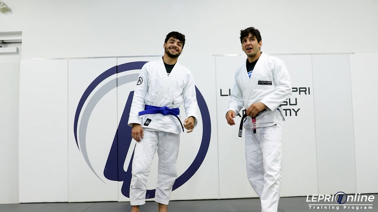 Professor Lucas Lepri teaches how to get an armbar or bow and arrow choke after pulling to the closed guard. Lucas and the opponent both start with collar and sleeve controls. Lucas releases the grip on the sleeve so he can use that hand to break the opponent's grip on the collar. Lucas grips underneath the arm and while still maintaining the grip, he pulls the opponent's arm across over his own chest. The other hand is used to reach behind the opponent's back to grab the belt. From here, Lucas steps closer to the opponent so he can place his foot on the hip to pull to the closed guard. In this variation, the opponent defends by lifting his leg once on the mat to block Lucas’ hip. Lucas now places his foot on the opponent's hip and uses it to pivot as he comes up on his shoulder as if he is going to take the opponent’s back control. He releases the grip on the arm and uses his foot to spin the opponent to the side letting him get to the s mount position. From this position, Lucas can finish with an armbar or reaches for the collar to go to the bow and arrow choke.