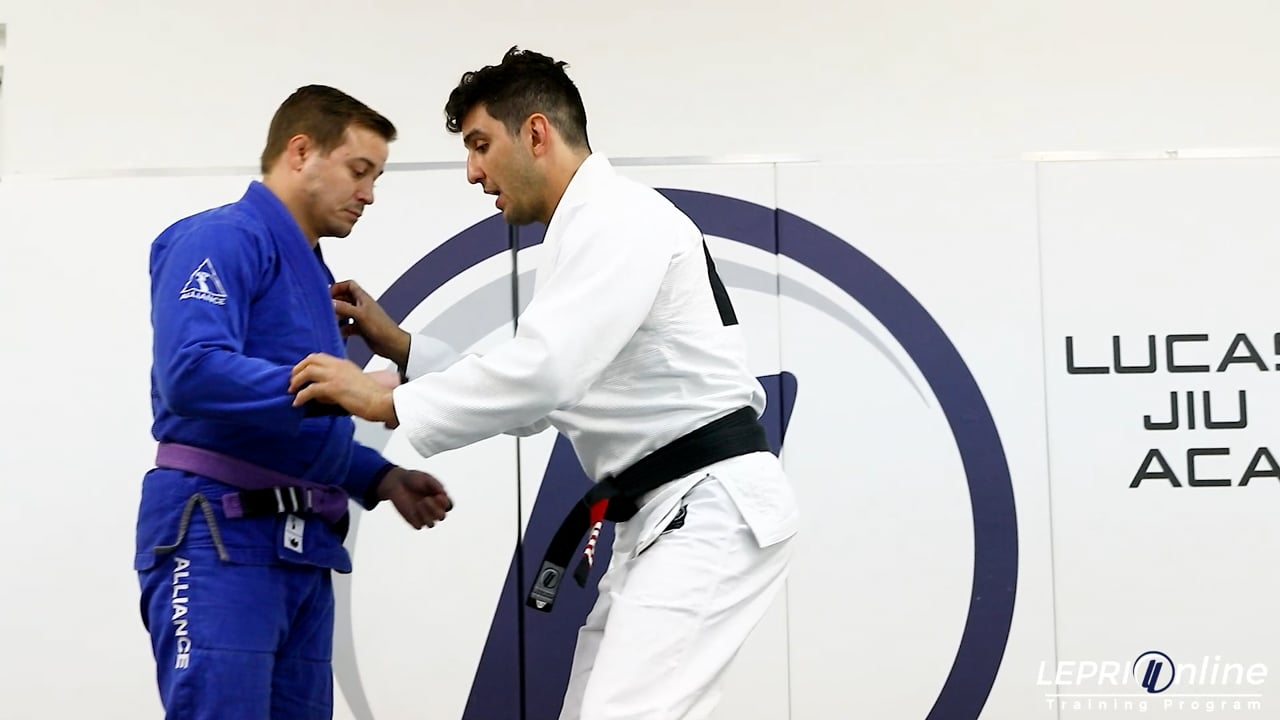 Professor Lucas Lepri teaches how to sweep the opponent from the closed guard when they stand up. Lucas has a closed guard and is controlling both sleeves. The opponent stands up in an attempt to open the guard. Lucas releases a grip on the sleeve and under hooks the same side leg near the ankle. Lucas pulls on the leg and uses his hips to push the opponent back. As the opponent falls to the mat, Lucas maintains his closed guard and arches his body forward so he can then open the guard and take the mount position
