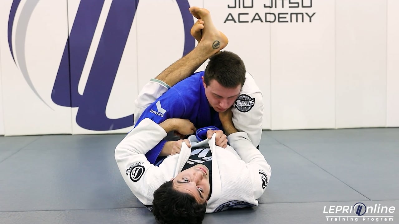 Professor Lucas Lepri teaches how to get a shoulder lock submission from the closed guard. Lucas has the closed guard on the opponent. He grips the lapel with the same side hand and the same sleeve with his opposite side hand. He pulls the collar down and traps the elbow with his knee, preventing the opponent from pulling the arm out. Lucas lifts his other leg and raises it, setting his ankle near the back of the opponent's head. This motion also pushes the opponent slightly to the side. Lucas now moves the grip that was on the collar to the arm resulting with two grips over the same arm. Lucas now pushes the arm out as he bends his knee in to get the shoulder lock submission.