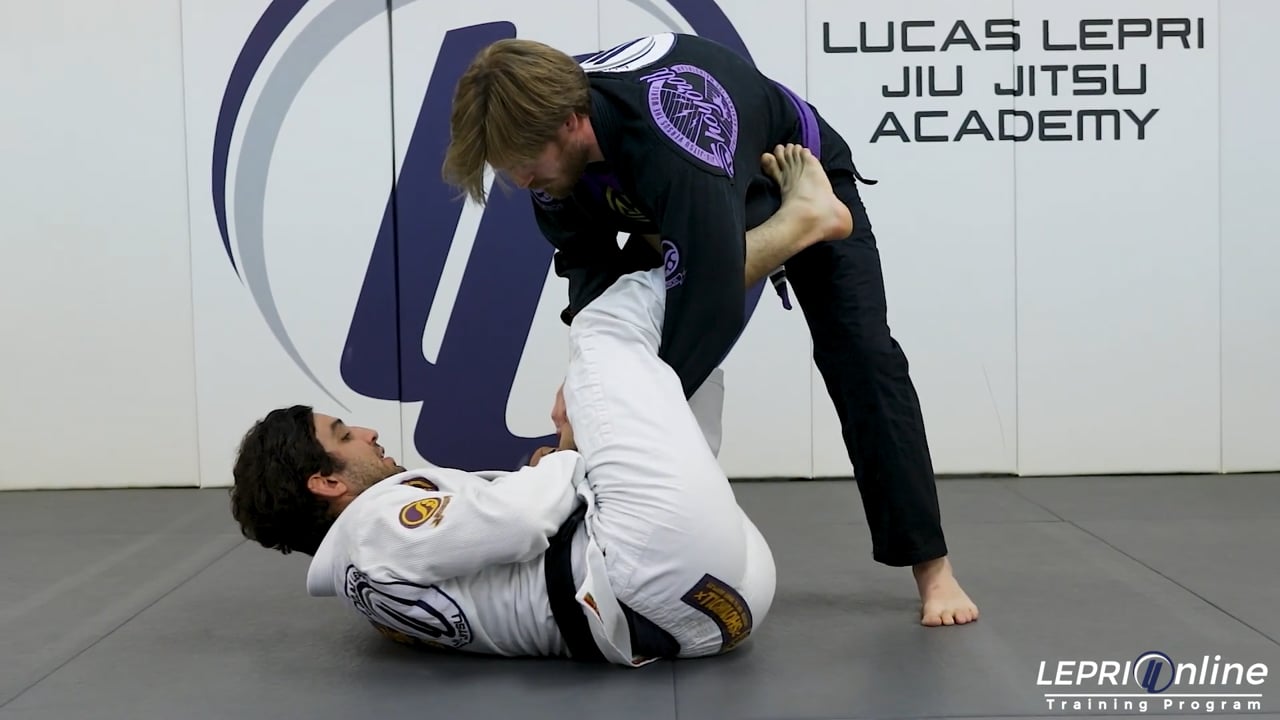 Professor Lucas Lepri teaches how to sweep the opponent and get to the knee on belly. Lucas starts with a spider guard. He circles on one leg around the arm so he can get the lasso position and spider. Lucas turns his hips to the side so he can break the opponent’s grip on the pants, allowing him to transition to the de la riva. Lucas now uses his legs to push the opponent away to create enough space for him to remove his de la riva hook and places that leg on the opponent’s hip. He once again shifts his hips to the side and slides his knee behind the opponent's leg. Both legs are now used to lift the opponent up and to sweep to the side. From here he keeps distance, and then moves in for the knee on belly position.