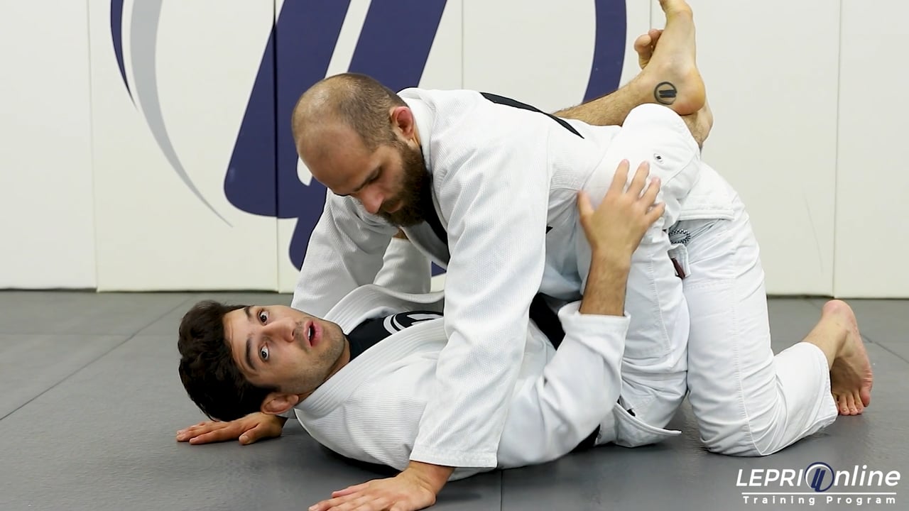 Professor Lucas Lepri teaches how to take the opponent’s back from the closed guard. Lucas has the opponent in his closed guard. He breaks down the posture by gripping the collars and pulling the opponent down making them post on the mat. He then connects his hands together behind the back for the double under. Lucas now grips the back of the opponent with one hand. The opponent tries to posture up and Lucas immediately comes up onto his elbow. He opens his guard and bumps the opponent's arm off with his shoulder and then immediately closes the guard from the side. He now makes his way to the back. He controls the near side arm to prevent the opponent from turning back and reaches over the back to grab the collar. From here, Lucas now pulls the opponent back and takes the back control.