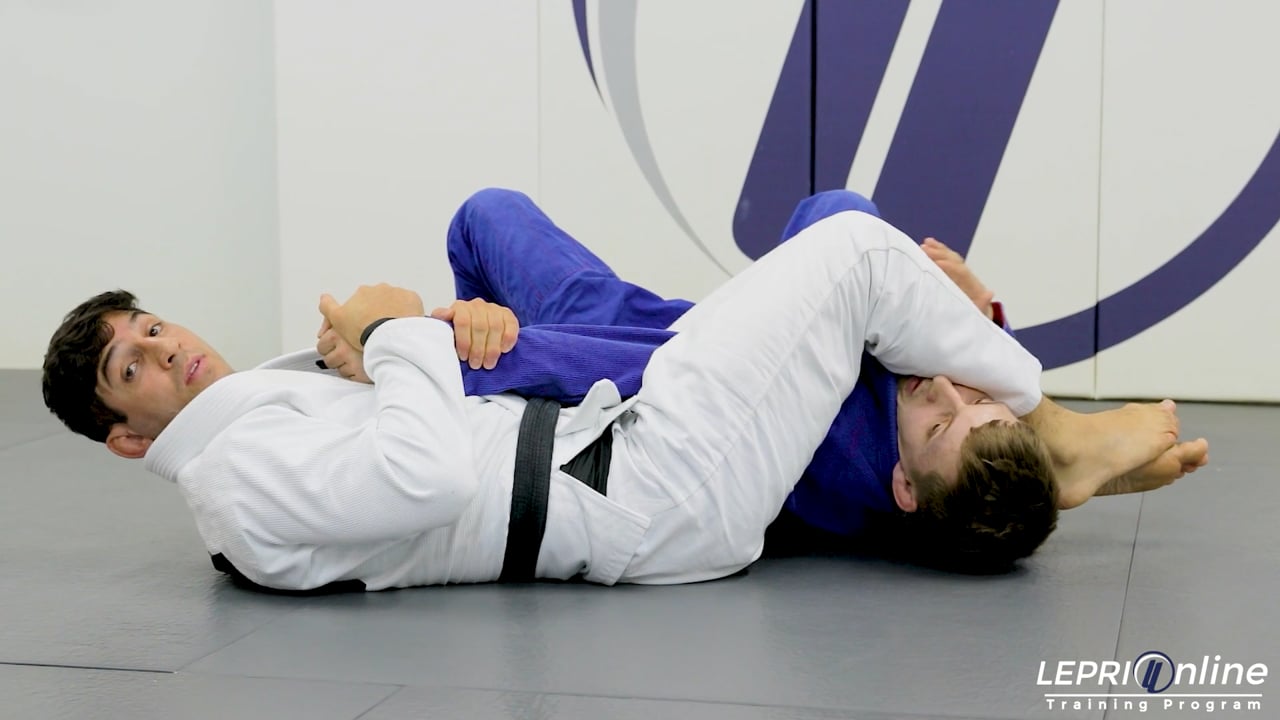 Professor Lucas Lepri teaches how to get an armbar submission after attempting to sweep the opponent starting with the knee shield. Lucas starts with the half guard and knee shield controlling the collar and sleeve. He releases the collar grip and under hooks the opponent’s arm so he can reach behind the back to control the pants. Lucas now switches the hooks on the opponent’s leg and traps it. He pushes forward and comes up. In this scenario, Lucas is not able to isolate the leg in an attempt to sweep. Lucas instead posts on the mat with his bottom hand and releases the grip on the pants to use that hand to control the opponent’s wrist. He now brings his top leg over the opponent and turns the opponent over trapping the arm for the armbar.