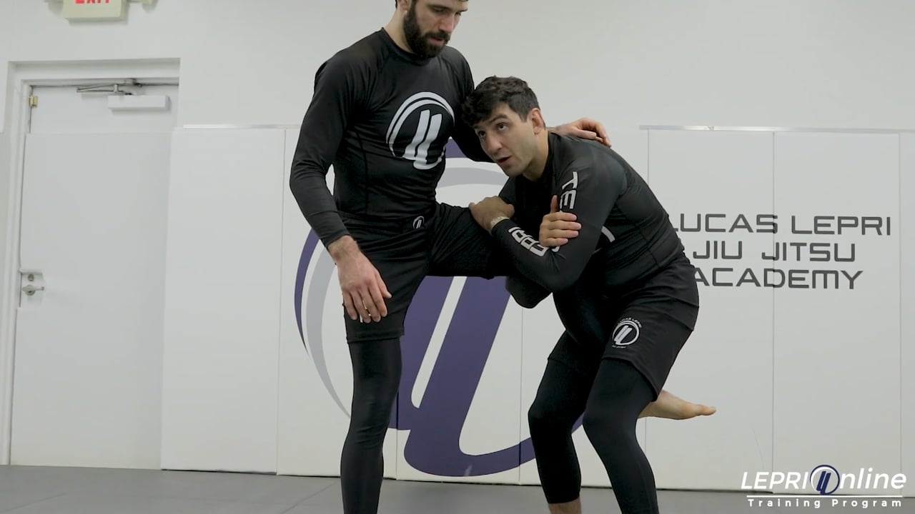 Professor Lucas Lepri teaches how to get a single leg takedown starting from the bottom. The opponent starts standing up and Lucas is sitting on the mat. As they are both hand fighting for grips, Lucas is able to control the opponent’s arm with a two on one grips. The near side hand controls the wrist and the other hand controls the same side elbow. Lucas pulls the arm across making the opponent post on the mat. He takes advantage of this and grabs the leg as he comes up. From here, Lucas uses the single leg to take the opponent down.