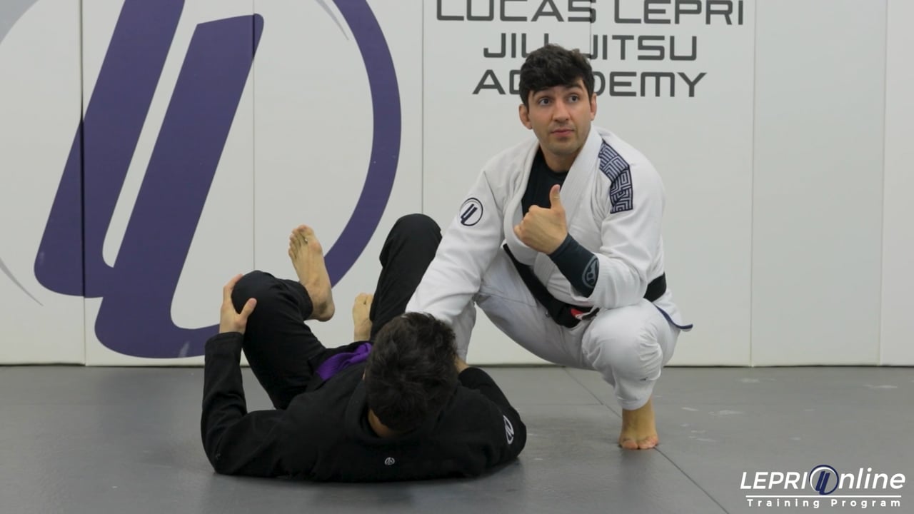 Professor Lucas Lepri teaches how to counter a guard pull using a jump pass. Lucas and the opponent both start standing. The opponent moves in and attempts to guard pull on Lucas. Lucas immediately counters it by placing his inside hand on the opponent’s chest and his other hand grips the same side leg. He uses the hand on the chest to help him jump up. As he jumps, Lucas pushes the leg to the side and gets on the side of the opponent. The opponent reacts by turning away. Lucas keeps his knee on the opponent's side as he turns. As soon as the opponent raises his legs, Lucas takes the opportunity to get his hooks in to take the back.