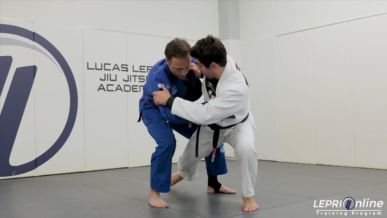 Professor Lucas Lepri teaches how to take the opponent down using the ouchi gari takedown. Lucas starts controlling the collar and sleeve. He pulls the opponent back using the collar grip. This makes the opponent take a step forward. Lucas takes a step forward and slides his foot behind the leg the opponent stepped forward with. He drops that leg to the knee and hooks the opponent’s leg. Lucas uses his leg to pull the opponent’s back, as he also uses the grip on the collar to push the opponent to the side. This takes the opponent down where Lucas lands in the opponent’s closed guard.