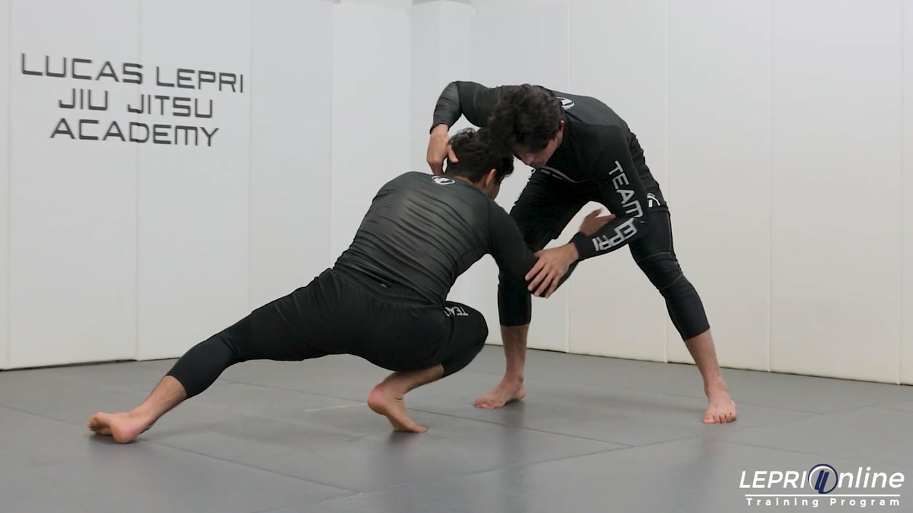Professor Lucas Lepri teaches how to get a head and arm choke, after attempting to take the opponent down using a single or double leg takedown. Lucas shoots for the double leg and the opponent defends by sprawling. He immediately reaches for the single leg but the opponent is still able to defend by keeping the leg away. Lucas now bases his outside leg while still controlling the single leg and then steps in, stepping over the opponent’s leg in a half guard position. He now reaches for the hips and controls the opponent. The opponent tries to defend by over hooking Lucas’s arm. Lucas is able to push the opponent with his shoulder making the opponent release the over hook to post on the mat. This now allows Lucas to come up on top while the opponent resorts to the turtle position. In this variation, the opponent tries to escape the position by turning into Lucas. Lucas releases the hook on the foot and uses that leg to post out. He now brings his inside arm in between the opponent’s arms and slides it behind the opponent’s neck. He maintains pressure over the shoulder with his head and connects his hands together. From here, Lucas finishes in the Kata Gatame position.