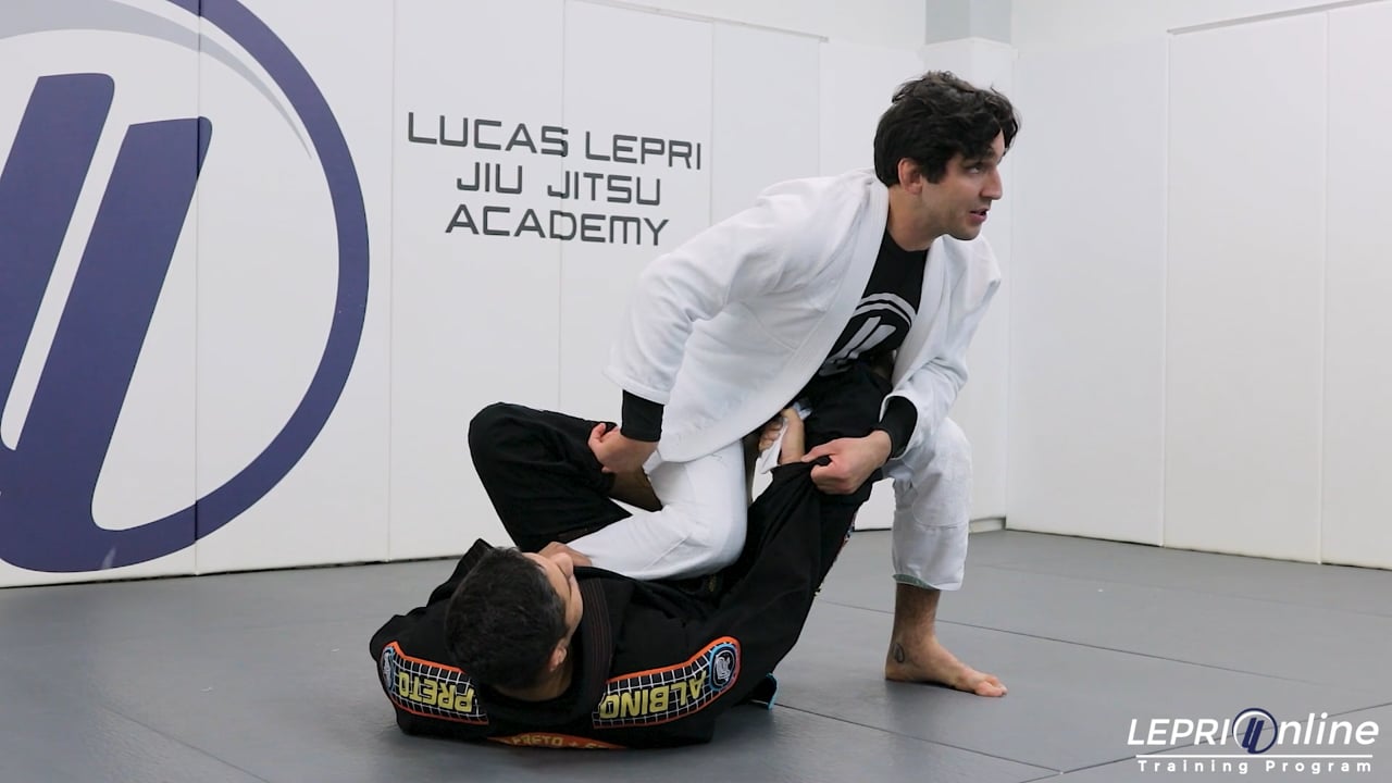 Professor Lucas Lepri teaches how to escape from the lapel control when the opponent has the de la riva. The opponent starts with the de la riva and is controlling Lucas’ lapel under the leg. Lucas starts to defend by gripping the opponent’s sleeve and locking his arm over the leg. He uses his other hand to push the de la riva side leg down. As he pushes the leg down, he lightly steps his leg to the side and slides it over the opponent’s calf to break the pants grip. His other knee is placed over the same leg near the middle. Lucas now grips the collar and pivots over his outside knee, sliding his body out to the side. He stops there for a second to release the grip on the sleeve and switch the grip to the bottom leg. Lucas moves back in by sliding his knee in first and then turns to the side to get the side control position.