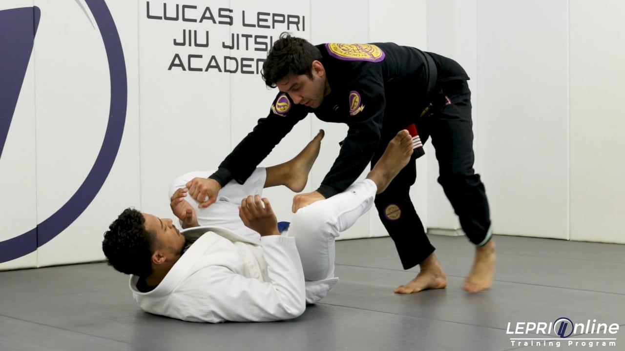 Professor Lucas Lepri teaches how to pass the guard using the knee cut pass. Lucas starts standing and the opponent has their feet on Lucas’ hips. Lucas reaches for the pants and grips both legs on the inside. He steps back and creates space. Lucas picks a side and starts to walk around. Whichever side he picks, he steps to that side and pushes that side knee down. He now slides his knee in and places it over the opponent’s leg while posting out with his other leg. As he moves in, he under hooks the opponent’s top side arm. The opponent reacts by framing on Lucas’ shoulder. Lucas releases the grip on the knee and uses that hand to pull the opponent’s arm up and out of the way. From here, Lucas slides his knee thru and keeps his hips next to the opponent. He slides his leg back and finishes on the side control position.