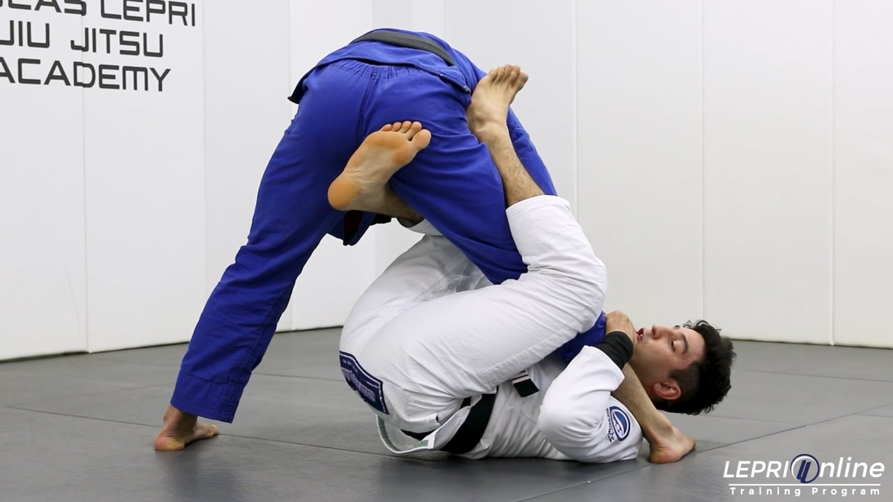 Professor Lucas Lepri shows how to get a knee bar after attempting to sweep using the single leg x. Lucas starts with the de la riva and the opponent pushes his leg down. He uses the opponent’s action to pull on the collar to unbalance him. By pulling on the collar, Lucas makes the opponent post on the mat with their hands. This makes their leg lighter so Lucas can under hook it and transition to the one leg x. He attempts to sweep the opponent from this position, but the opponent maintains their base. Lucas keeps tension on the opponent and uses it to under hook the leg, bringing the foot all the way to the shoulder. Lucas now switches the hooks under the legs for an x guard variation. He uses this position to lift the opponent up. Once up, he figure fours his legs and sweeps the opponent back. The position that they land on makes it perfect for Lucas to get a knee bar submission.