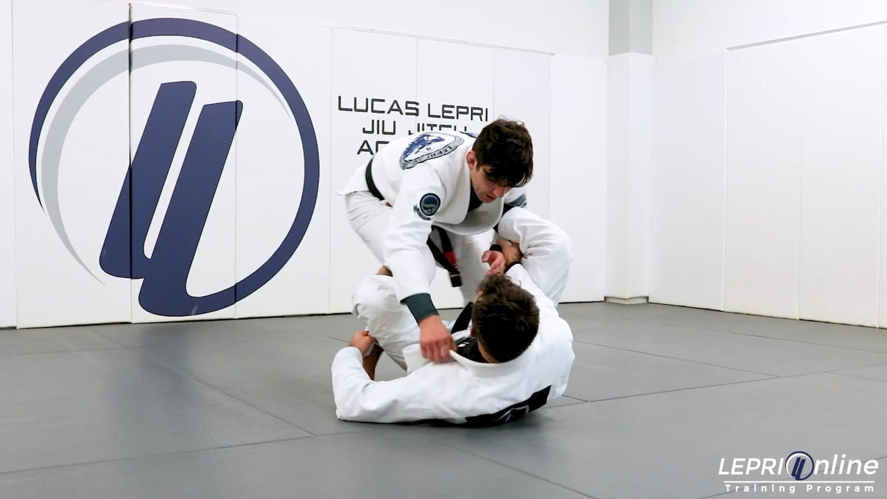 Professor Lucas Lepri teaches some concepts on how to escape and pass when the opponent has the de la riva and lasso. The opponent starts with the de la riva and lasso control. Lucas starts to escape by pushing the de la riva leg down near the knee. As he is pushing the leg down, he also uses his own knee to force the opponent to open that leg. Lucas, by dropping his knee to the mat over the opponent’s leg, creates enough space where he can then bring his other knee in. For a split second, Lucas places both of his knees on the opponent’s leg. He then immediately reaches over, hopping over the leg and clubs the back. He maintains shoulder pressure over the opponent’s neck to prevent the opponent from coming back. From here, Lucas is then able to move to the side and go for the knee on belly.