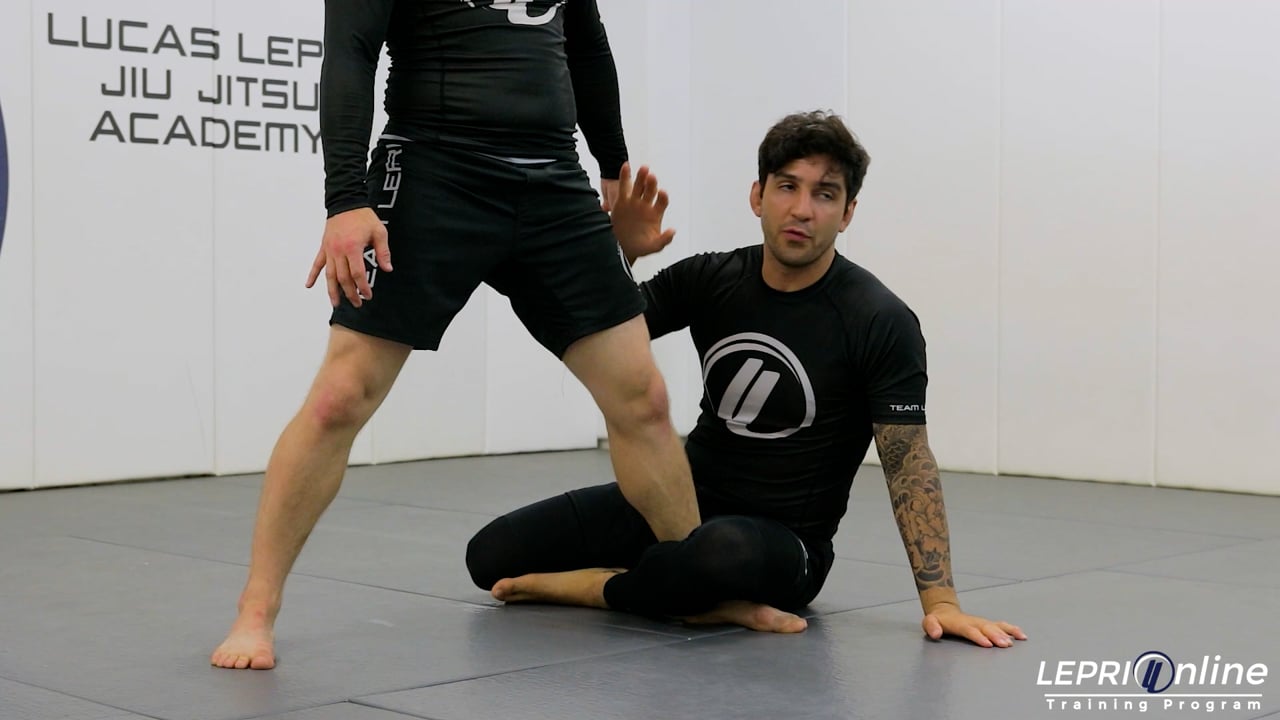 Professor Lucas Lepri shows how to get to the opponent’s side control after attempting a single leg takedown from the reverse de la riva. Lucas starts standing up, controlling both of the opponent's wrists. He then moves into the reverse de la riva. The opponent moves in and applies pressure in an attempt to defend. Lucas uses his outside foot to push the opponent on the hip while still maintaining his reverse de la riva hook. As he pushes, this creates space and pushes the opponent away. Lucas sits up in an attempt to go for the single leg, but the opponent pushes back with their knee. Lucas allows the opponent to push back so he can underhook the far side leg with his hand and uses the momentum to push the opponent away. He does a technical stand up while still controlling the leg and then moves in to clinch the back. The opponent attempts to recompose the guard by spinning back and Lucas just follows and gets the side control.