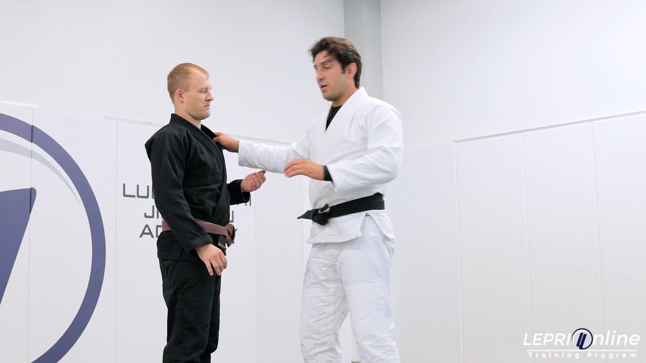 Professor Lucas Lepri teaches how to sweep the opponent using the lasso after he recomposes when the opponent attempts to pass. Lucas and the opponent start standing up. Lucas is controlling the collar and sleeve. He goes to pull guard and immediately lassos the arm. The opponent attempts to pass by pushing Lucas’ inside leg down and starts moving to the side applying their weight on Lucas. Lucas recovers the position by rocking back and forth, this allows him to use the momentum to push the opponent away. With the opponent pushed away, Lucas faces the opponent once again while still maintaining the lasso on the arm and the collar grip. He now pulls the opponent in. When he feels that the opponent’s weight is shifted, Lucas pushes the opponent up with his legs and does a backward roll to sweep. Lucas now lands right on the mount control.