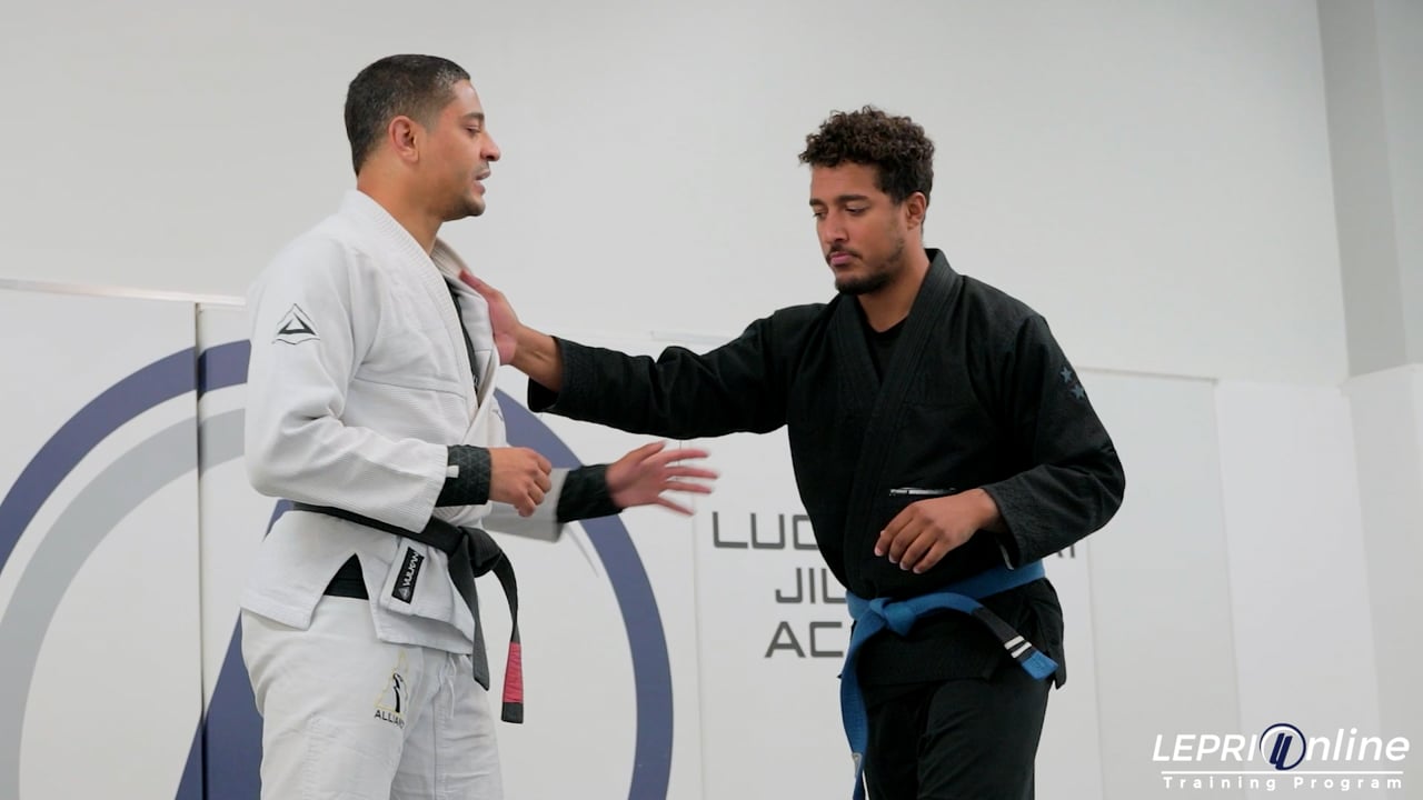 Professor André Gois shows how to break a collar grip by gripping the opponent’s collar. The opponent moves in and grips André’s collar. André reacts by gripping the same side collar, but going under the arm. Whoever has this grip under the arm, has better control. André now grips his own collar near the opponent’s grip. He breaks the opponent’s grip by first pulling the lapel away from the hand, then uses his shoulder to push on the hand and lastly he uses the arm to lift the opponent’s arm. These three motions allow André to break the opponent’s lapel grip.