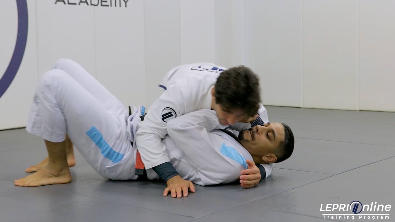 Professor Lucas Lepri teaches how to get the kimura or armbar submissions from the north south position. Lucas starts in the side control position. The arm that was underneath the head is now brought out and placed in line with his other arm to control the opponent. The opponent is using the frame to defend. Lucas now starts to turn his body away by controlling the hip and places his legs in line with the opponent's head for the north south position. Lucas now uses his shoulder and control of the arm to isolate it. Once the arm is isolated, he locks in the kimura grips. Once he locks in the arm, he places one leg over the opponent’s free arm and uses his other leg to post out on the mat. Lucas pulls the arm up and twists to the side to finish with the kimura submission. If the opponent defends, then Lucas can turn to the side and go for an arm bar instead.