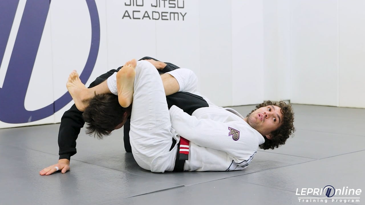 Professor Frederico Silva teaches how to get the omoplata submission starting from the open guard. Frederico goes for the de la riva and then pushes on the opponent's hip to create space so he can loop his foot over the arm to get the lasso. Frederico is now in the de la riva with the lasso. The de la riva grip on the pants is now moved to the cross collar. Frederico now uses his feet to push the opponent away. The opponent maintains the grip near the waist, so Frederico uses his the de la riva side foot to push on the shoulder and breaks the opponents grip. He now pulls the opponent's arm in on the side he had the lasso. Once he pulls the arm in, he brings his leg over it and locks his legs together to lock in the Omoplata. From here, Frederico now finishes with the omoplata submission.