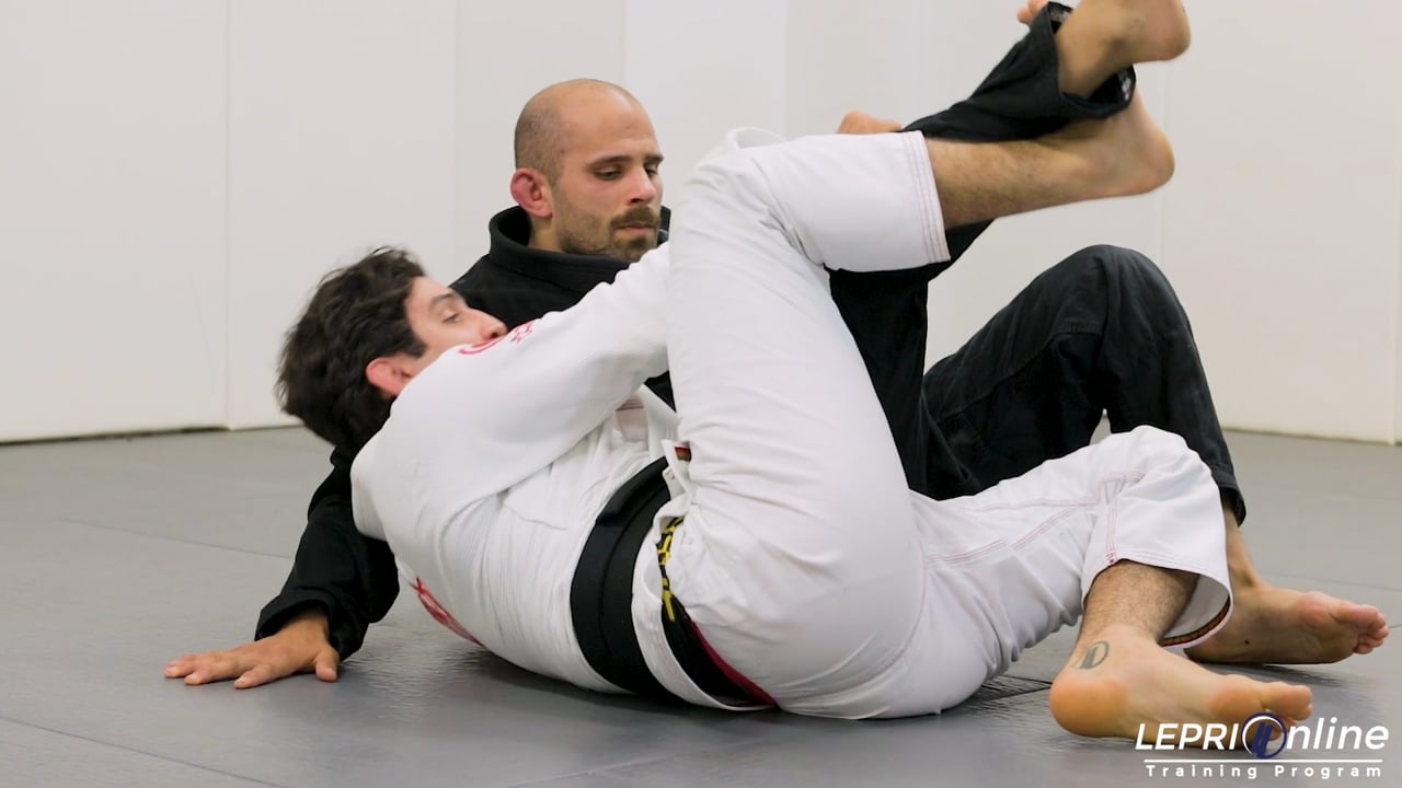 Professor Lucas Lepri shows a variation of a sweep attempt when the opponent gets the reverse half guard. Lucas shows how to use the lapel and hooks on the opponent’s feet to elevate the opponent in an attempt to sweep. In this scenario, when Lucas attempts to sweep, the opponent steps back and uses the leg to post. When this happens, Lucas hooks the bottom leg with his foot and pushes forward. He then leg drags the top leg over his thigh. From this position Lucas now reaches in front of the opponents collar and connects his hand thru the back to the inside of his lapel to finish with the Ezekiel choke.