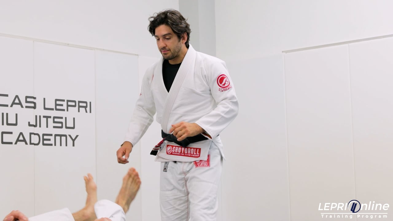 Professor Lucas Lepri teaches how to get a straight ankle lock from the top, when the opponent has the lasso and spider guard. Lucas first works on removing the opponent’s spider side grips. He does this by circling the arm around the inside of the leg. He then immediately starts pushing the leg down. Lucas starts to lean forward so he can grab his own collar on the de la riva side. The outside leg is now brought in and across the opponent to the other side. From here, Lucas now drops his hips down and finishes the straight ankle lock from the top.
