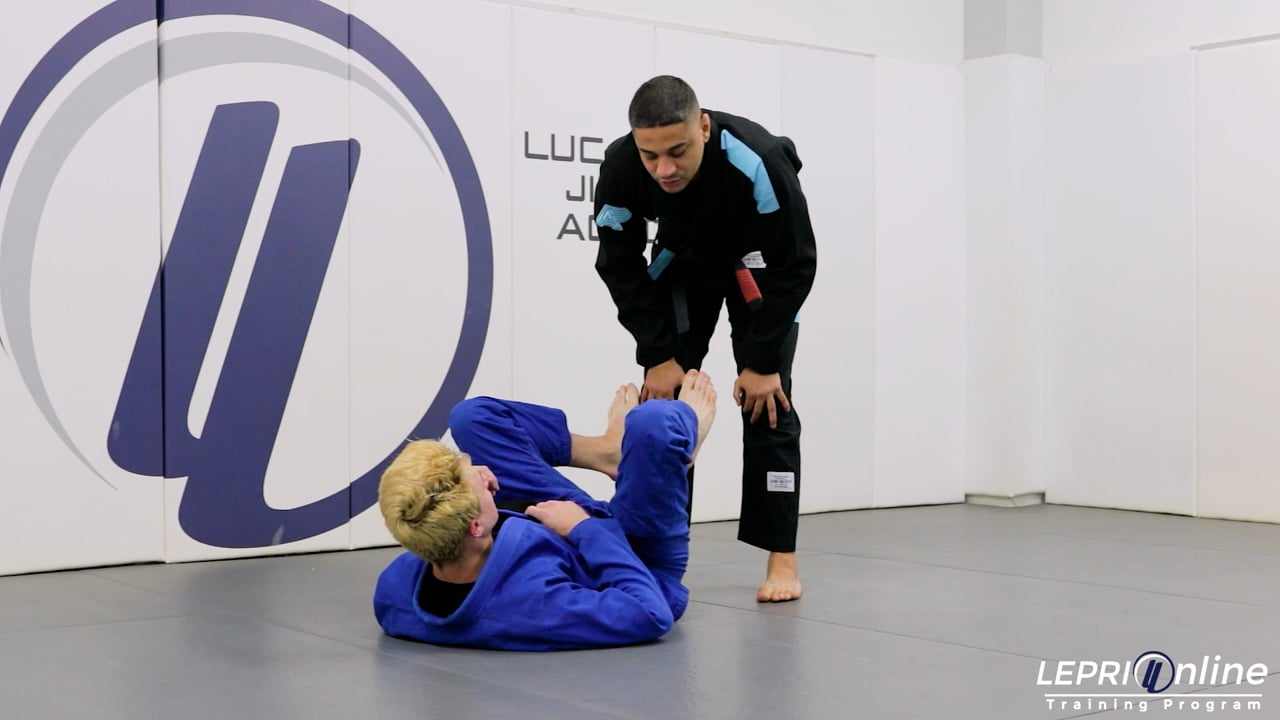 Professor André Gois teaches how to perform the long step pass when the opponent has the reverse de la riva. André starts to pass using the knee cut, but is not able due to the opponent having the reverse de la riva and pushing on the chest. André adjusts his grips and brings his outside knee close to the opponent. He then drops his body and steps out with his knee cut leg. This puts André perpendicular to the opponent where he then moves in and goes to the side control position.