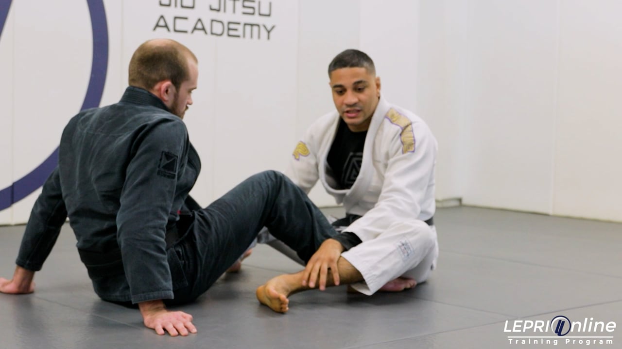 Professor André Gois teaches how to get to the back control using the Berimbolo. André and the opponent start on the mat, with André having the de la riva hook on one leg. André is also controlling the same side ankle with his hand. André now reaches for the cross collar with his other hand. He uses the collar grip to roll over the shoulder to get inverted. From here, he uses a combination of grips and leg hooks to force the opponent to spin over the legs to take the back control.