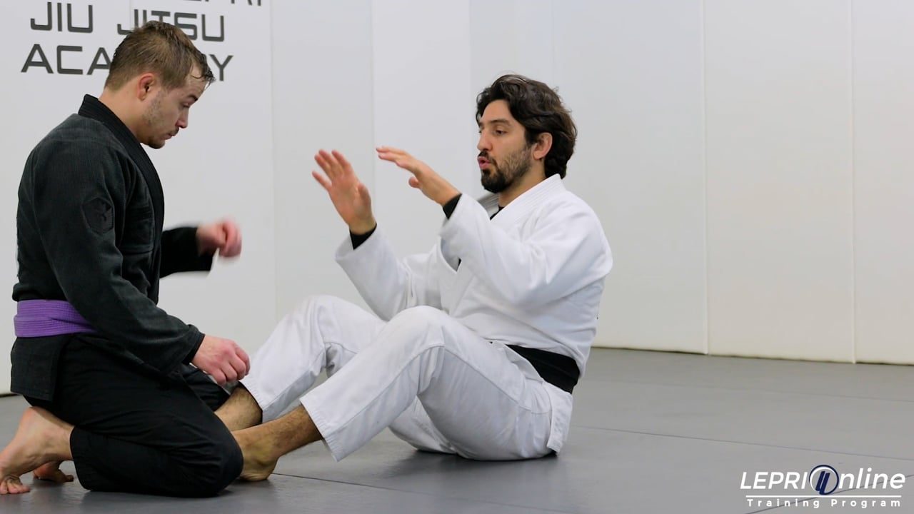 Professor Lucas Lepri shows how to sweep the opponent, after first attempting a butterfly sweep. Instead of using traditional grips for the butterfly sweep, Lucas reaches for the opponent’s belt and grips it in the middle. Lucas extends his arm and uses his elbow on the chest to control the opponent. He now grips the sleeve with his same side hand. He pulls the opponent in using the belt grip, places his elbow on the mat and raises the opponent up with his butterfly hook. Lucas attempts to sweep but the opponent defends by posting his leg out. Lucas counters by immediately under hooking the leg and transitions to the one leg x controlling the same side sleeve. He now pulls the opponent forward as he rolls over the shoulder to sweep.
