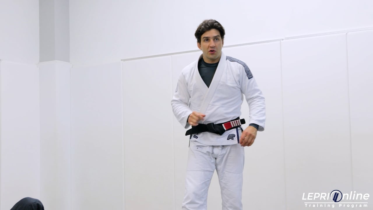 Professor Lucas Lepri shows how to take the back after attempting to pass. Lucas places one hand on the opponent’s hips and the other hand grips the pants. Lucas pushes the pants down and starts to pass to the side, but the opponent defends by pushing on the arm and bringing the leg over. Lucas releases the pants grip and under hooks the leg as he also slides his knee over the bottom leg. This allows Lucas to move to the other side where he immediately controls the back of the collar. From here, Lucas shows various scenarios where he uses his feet to hook and block the opponent’s leg so he can then get his hooks in to take the back control.