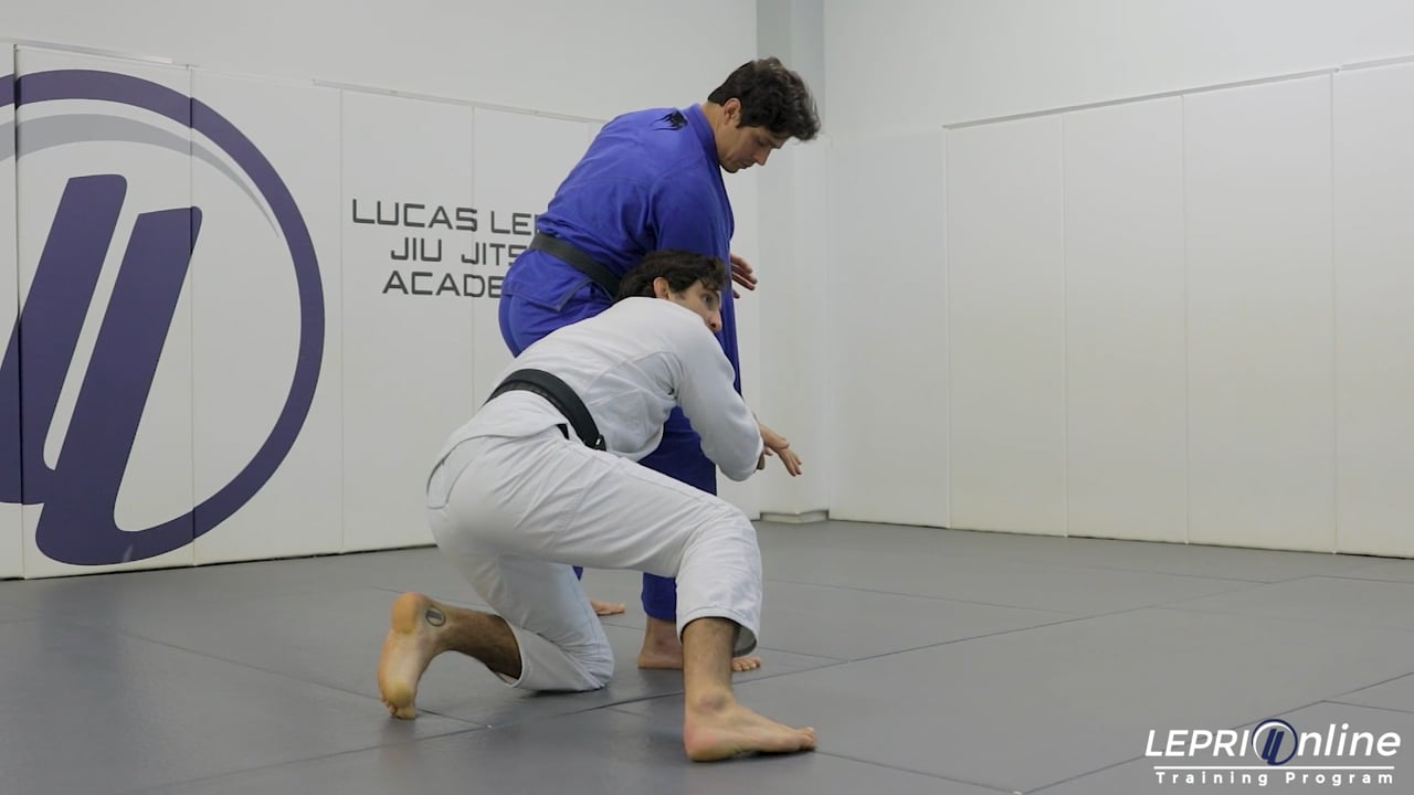 Professor Lucas Lepri shows how to break the opponent’s collar grip and move in to a low single takedown. Lucas explains how to break the opponent’s collar grip by using both of his hands. After he breaks the grip, he maintains control of the sleeve and pushes it across the opponent. Lucas now shoots for the low single and maintains the sleeve grip. He connects his hands together and takes the opponent down.