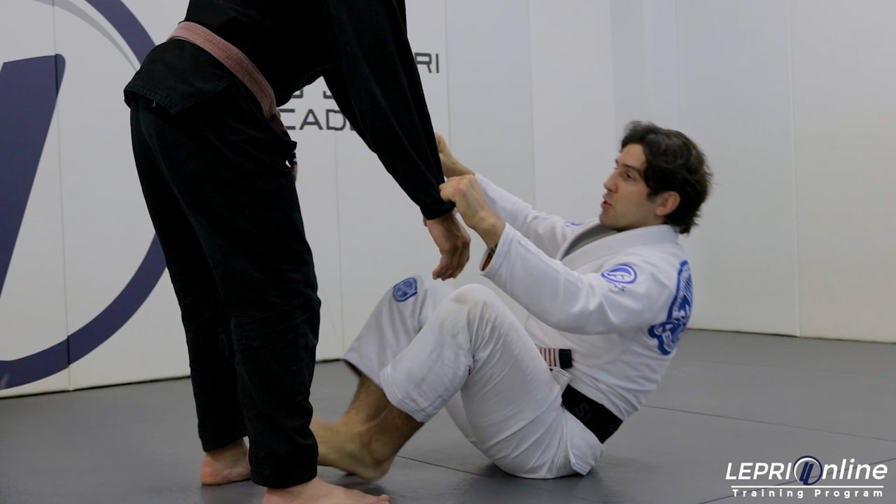 Professor Lucas Lepri teaches how to sweep the opponent over the head by using the lasso and de la riva variation. Lucas starts in the open guard and gets the lasso on one side. With the opponent's leg close, he is also able to get the de la riva on the lasso side. In this scenario, the opponent steps back to defend. Lucas hooks the other leg now with the same lasso side leg. This position allows Lucas to use his grips and legs to raise the opponent and sweep over the head. Right after the sweep, Lucas immediately goes for the armbar submission. If he is not able to, then he goes to the side control position.