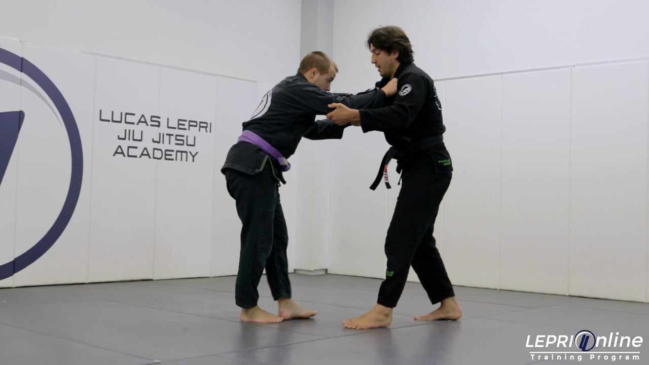 Professor Lucas Lepri shows a one leg x sweep, after pulling guard. Lucas starts with controlling the collar and sleeve. He pulls on the opponent to break the posture and the opponent reacts by posturing up. Lucas takes advantage of this reaction to grip the belt and pull guard. He uses his leg to push the opponent forward so he can go to the one leg x. Lucas explains when to switch grips and then shows how to sweep the opponent back.