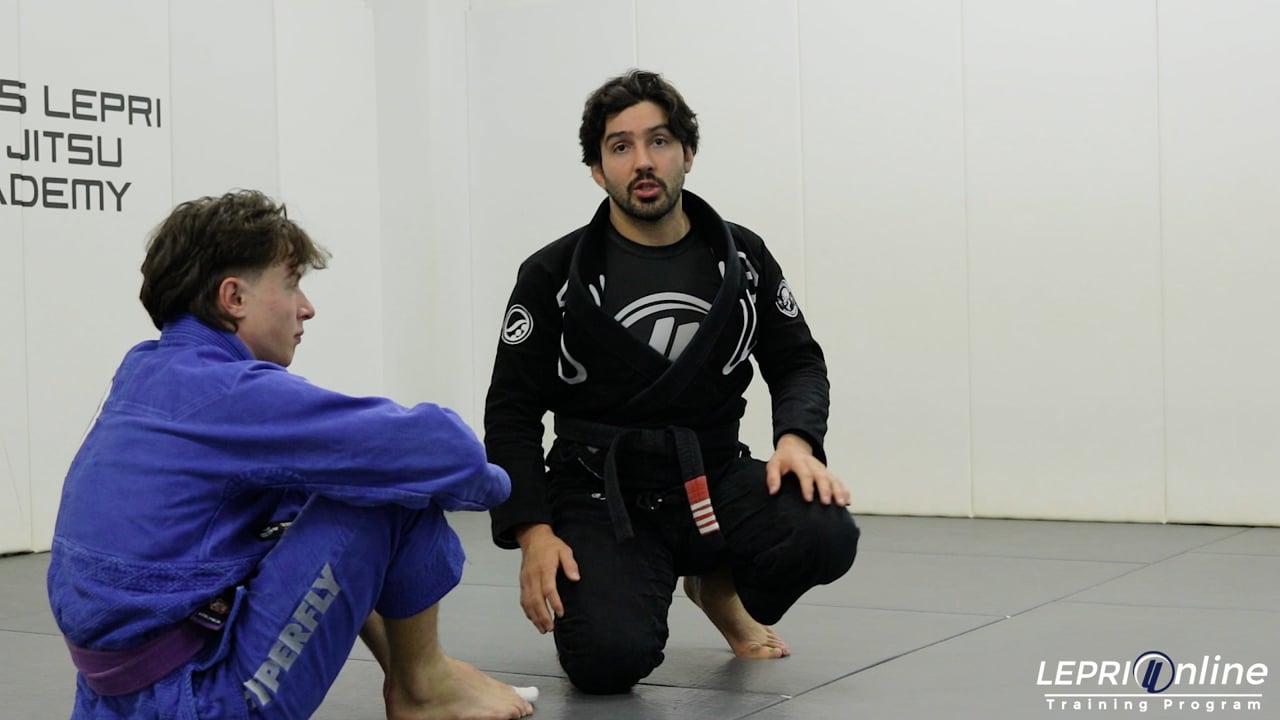 Professor Lucas Lepri shows a variation on how to counter a butterfly sweep attempt. The opponent has the butterfly guard and is controlling Lucas. In this variation, the opponent is controlling Lucas by reaching the belt over Lucas’ shoulder. This limits Lucas’ ability to pass. He does so by shifting this base to the side of the arm that is over the shoulder. Lucas uses his hands to push the opponent’s legs down so he can fully get to the side. From here, Lucas can stay on the side control or also mount the opponent.