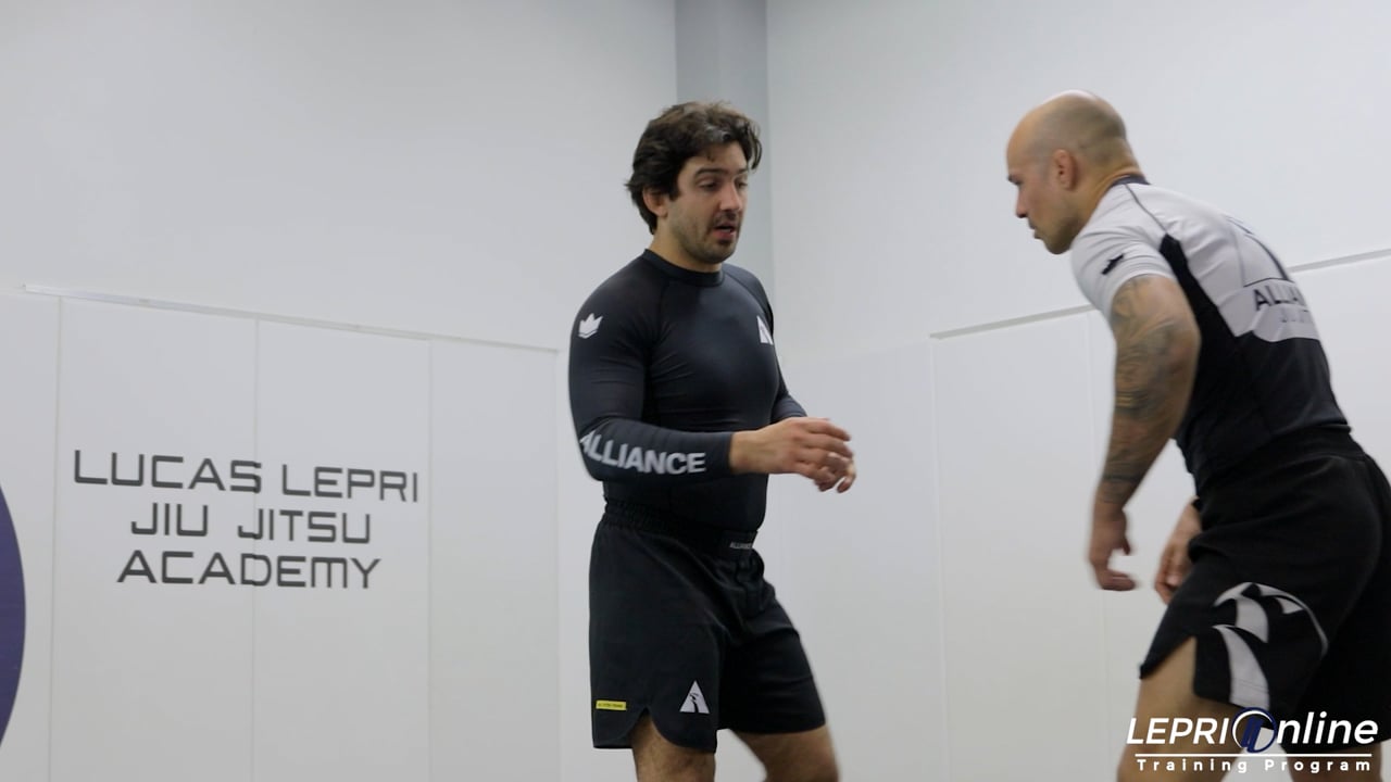 Professor Lucas Lepri teaches how to take the opponent down using the front head lock. Lucas has the front head lock and he uses it to pull the opponent down and make them post on the mat. When the opponent posts on the mat, Lucas spins to the side and hooks the near side leg. While still controlling the head and the leg, Lucas pushes the opponent and takes him down. Lucas maintains his legs near the opponent’s to prevent the opponent from escaping. The opponent attempts to push Lucas’ leg. Lucas takes advantage of this to loop his arm under the neck, out the back. He locks his arms together and finishes with the arm triangle.