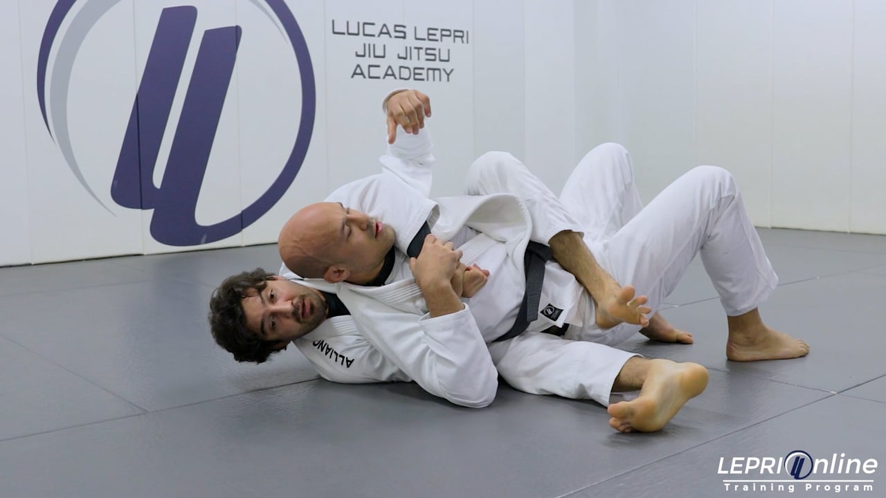 Professor Lucas Lepri teaches how to take the opponent’s back, using the sit up guard. Lucas starts with the de la riva. He explains how to push the opponent and use the grip on the sleeve to help him come up. As he comes up to the sit up guard, in this scenario, Lucas is not able to grip the collar with the hand under the leg. He instead controls the sleeve of the far side arm. He then also controls that same side collar. He pushes on the opponent’s far side leg in an attempt to sweep, but the opponent defends by coming in. Lucas moves back as the opponent is coming in, and hooks the foot with his own. This allows Lucas to lift the opponent’s leg, then pulls it down, making the opponent fall. From here, Lucas is now able to take the opponent’s back control.