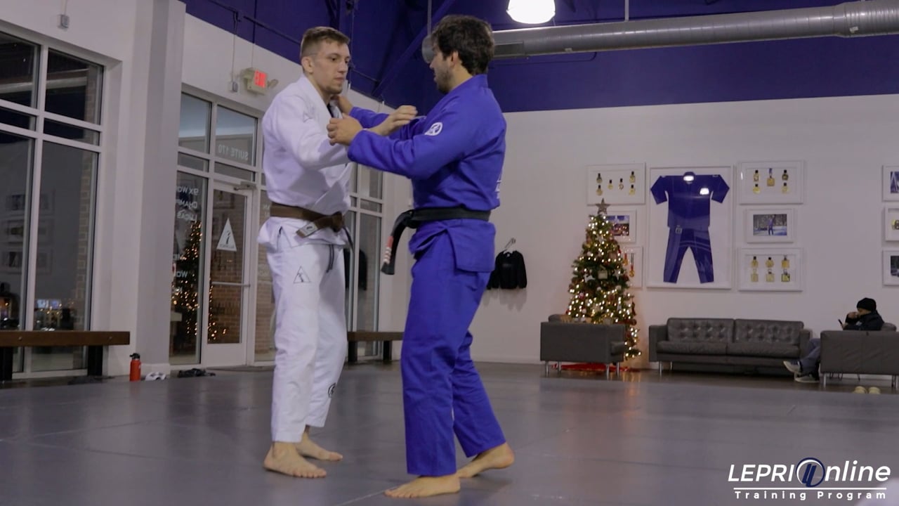 Professor Lucas Lepri demonstrates how to pull guard and effectively establish a closed guard. He starts by gripping the opponent's elbow and collar, then steps to the side and pulls the opponent down, disrupting their balance. He emphasizes the importance of grabbing the collar at the correct height and stepping across with the leg to create the necessary angle. This allows him to pull the opponent into his guard and secure a tight closed guard position.