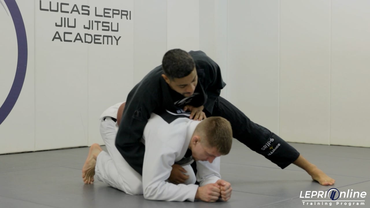Professor Lucas Lepri demonstrates a technique for countering the turtle roll escape and transitioning to a crucifix position. He starts by explaining how the opponent, when in the turtle position, might attempt to escape by rolling. Lucas shows how to anticipate this movement and maintain control, preventing the escape and using the opponent's momentum to secure a crucifix. From the crucifix, he demonstrates various submissions and control options.