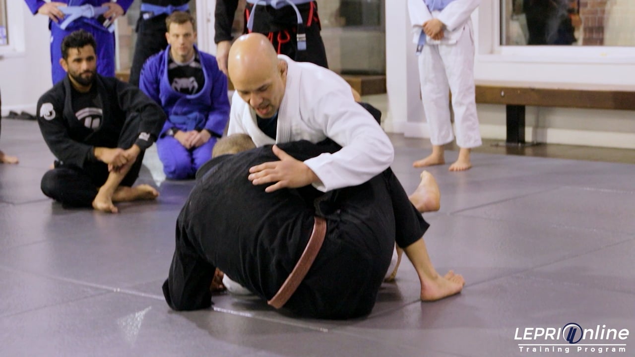 Professor Edson Oliveira demonstrates a technique for escaping from the half guard and maintaining control after he passes. He starts in a position where the opponent is attempting to keep the half guard. To prevent this, Edson establishes a strong position with his knee on the floor, pinning the opponent's leg and covering their under hook. He explains how this prevents the opponent from advancing their position. Edson then shows how to control the opponent's near side leg and use your head position to create space and maintain a dominant position. From here, he demonstrates different options for controlling the opponent or even passing to side control.