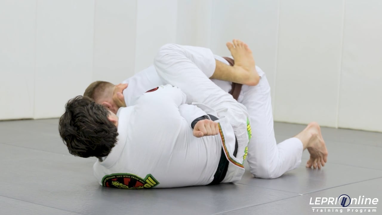Professor Lucas Lepri teaches safe guard recovery and a reverse armbar setup, emphasizing posture control. After recovering closed guard, he shows two scenarios: if the opponent bases their hands, he controls an arm with a cross-collar grip, using leg strength to maintain pressure and then sets up a reverse armbar by extending his arm and angling his hips. If the opponent maintains collar grips, Lepri traps an arm, secures the cross-collar grip, and uses leg extensions and hip positioning to create space and apply the submission, stressing the importance of keeping the opponent away for optimal pressure on the elbow.