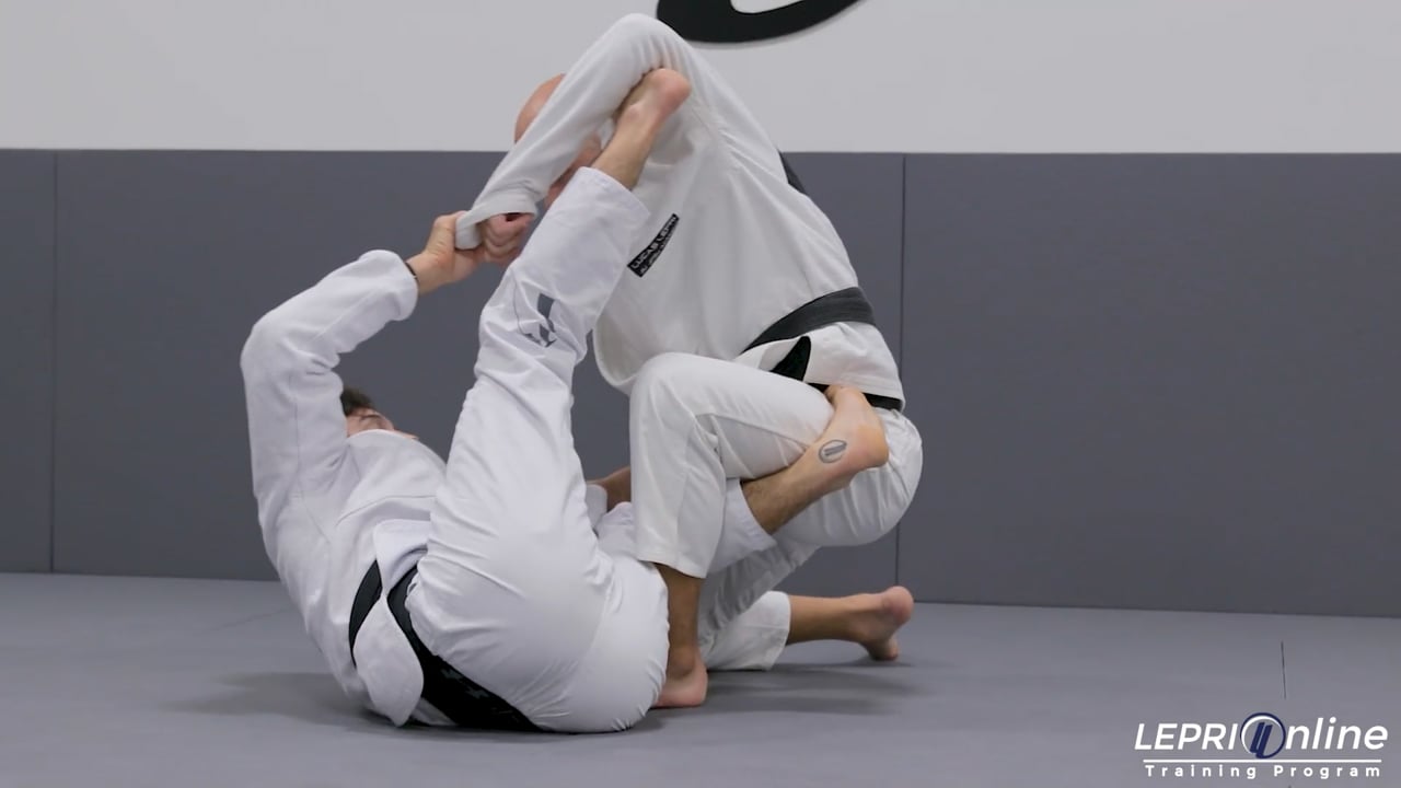 Professor Lucas Lepri show a spider guard with reverse de la riva sweep. Lucas starts in the open guard with the opponent having both knees on the mat. Lucas transitions to the spider guard on one side. The opponent starts to stand up in an attempt to counter, but Lucas immediately puts the reverse de la riva on the same side of the spider guard control. Lucas uses the spider guard to force the opponent off balance. In the variation, Lucas is not able to sweep because the opponent bases. Lucas now uses the foot on the spider guard to bend the opponent back. This momentum allows Lucas to now sweep the opponent back. From here, Lucas comes up and passes using the Knee cut pass.