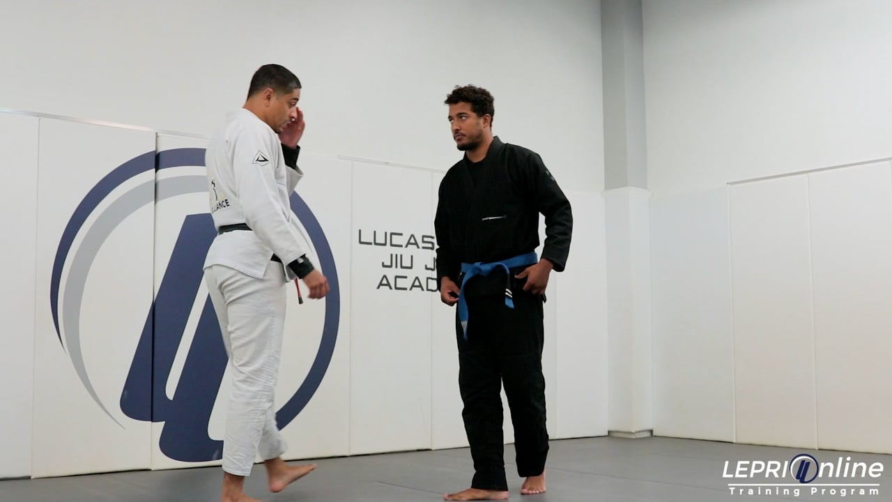 Professor André Gois shows how to take the opponent down using the Ouchi Gari, after breaking the collar grip. The opponent starts by gripping André’s collar. André slides his arm under the opponent’s and grips the same side collar. He proceeds to break the opponent’s grip on the collar while still maintaining the collar grip on the opponent. André now uses that grip to pull the opponent. When the opponent steps forward, André moves in and circles his near side leg behind the opponent’s. As he circles the leg in, he drops his knee to the ground and pushes the opponent back. This motion takes the opponent down. Immediately after the opponent goes down, André moves his far side leg in and uses his knee to block the opponent from closing the guard. From here, André can now pass.