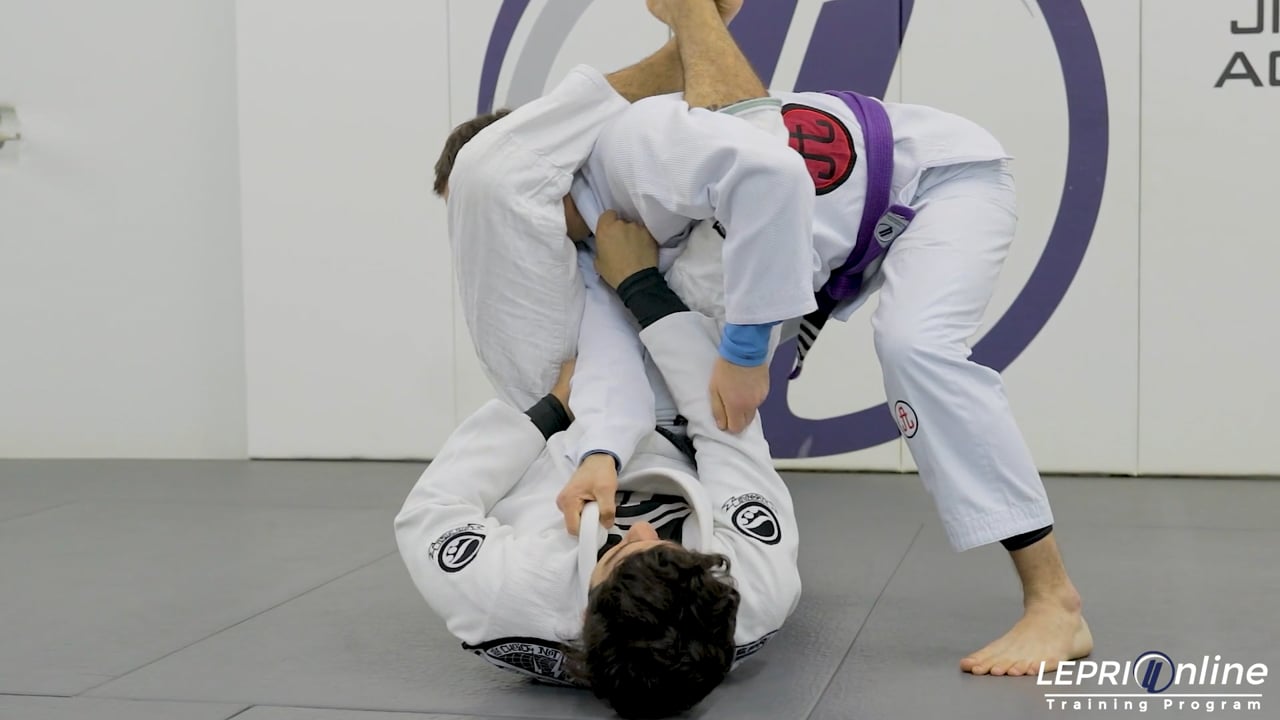Professor Lucas Lepri teaches how to pull guard and get the armbar when the opponent defends. Lucas is controlling the collar in the sleeve. He places his foot on the opposite side hip of the controlling arm. He falls to the ground while maintaining the foot on the hip and spins on his back as he pulls the arm down. This momentum allows Lucas to bring his outside foot over the head to get the armbar. In this variation, Lucas is not able to finish the armbar from this position because the opponent stacks to defend. Lucas slides his outside arm over the opponent’s and cups his own thigh. The other hand is used to grip the opponent’s near side leg. He uses that leg to pull the opponent in so he can then reach for the far side leg. Lucas now pushes the opponent forward and finishes the armbar from the top.