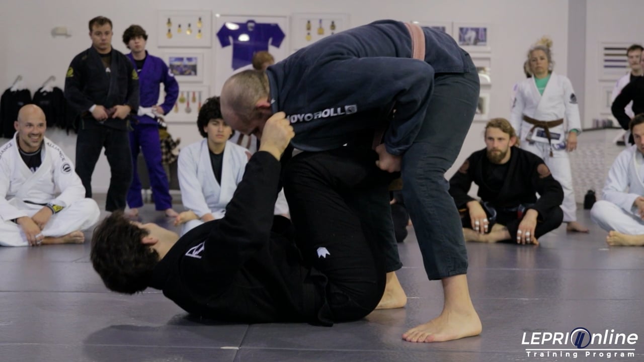 Professor Lucas Lepri continues demonstrating guard transitions, focusing on the opponent's reaction of basing their hand on the mat. He explains how to react when the opponent bases their hand to prevent the sweep, emphasizing hip adjustments and maintaining a low posture. Lepri shows how to use the opponent's hand placement to create opportunities for transitions, including using a "pit stop" technique to reposition the knee if the opponent defends. He emphasizes maintaining control and adjusting angles to create effective sweeps and maintain dominant positions.