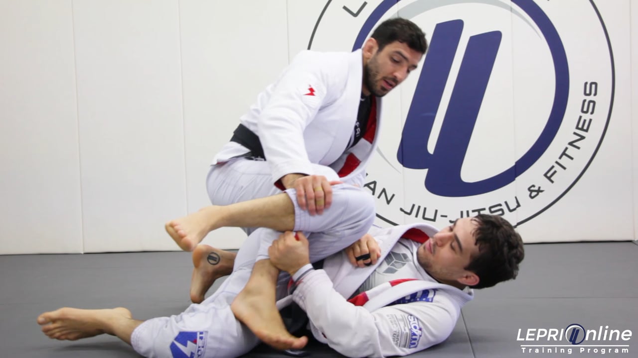Professor Lucas Lepri demonstrates what to do when the opponent holds the pant leg to prevent Lucas from executing the escape shown in the previous technique. As in the previous technique, Lucas first pushes on the opponent’s lower leg to escape his knee. In this situation, the opponent prevents Lucas from completing the escape by keeping his grips on the pant leg, keeping Lucas’ foot trapped. Lucas puts his weight forward, putting his foot on the ground across the opponent’s body. He pushes the opponent’s knee down and uses his other hand to establish a same-side collar grip. Lucas uses his elbow and knee to put pressure on the opponent, keeping the opponent’s knee down. Lucas then grabs the opponent’s back as he drops his knee on the floor and clubs the head. From here Lucas can complete the transition to side control.