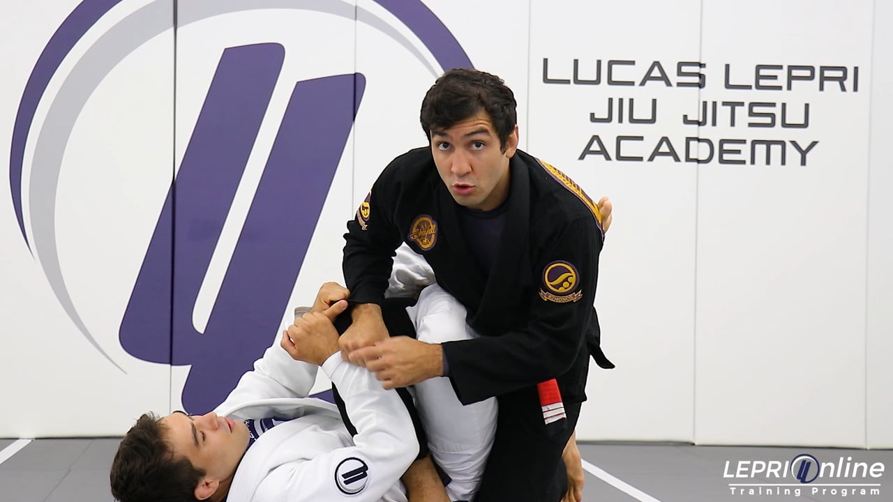 Professor Lucas Lepri teaches how to escape from the 50/50 guard. Lucas is trying to pass the opponent’s guard and the opponent is able to get him in the 50/50 guard. Lucas immediately grips the sleeve with his inside hand and places his outside knee against the opponent’s hips. Once the opponent’s arm comes out, Lucas immediately pulls it down and circles his top leg over the opponent trapping the arm. Lucas now places that knee on the mat. The opponent releases the grip on the leg and then Lucas releases the grip on the sleeve so he can under hook the opponent’s arm. From here, Lucas moves to the other side to the side control position.