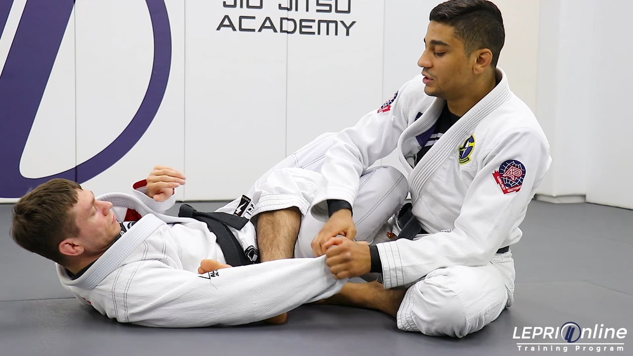 Professor Andre Gois teaches how to transition to the armbar from the 50/50 guard. Andre and the opponent are in the 50/50 guard and Andre immediately reaches for the arm to control the sleeve with both hands. He then places his foot over the opponent. As the opponent reacts, Andre slides his other foot out and pulls the arm towards himself. This places the opponent in the right position for Andre to then bring his foot over and get the armbar submission.