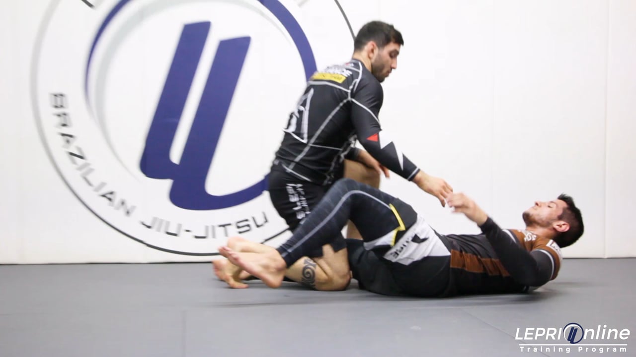 Professor Lucas Lepri demonstrates how to take down an opponent using an inside leg hook. The situation begins with Lucas and the opponent standing with no grips. He grabs his opponent’s same-side wrist and uses the far-side hand on the inside of the opponent’s elbow to drag the arm across his body. Immediately releasing the grips, Lucas steps forward with his far-side leg to wrap his leg around the opponent’s ankle. As he takes down the opponent, both of Lucas’ arms go around the opponents waist and around arm that was dragged. Lucas finishes in the opponent’s half guard. He clubs the head and uses a Gable grip to control the half guard.
