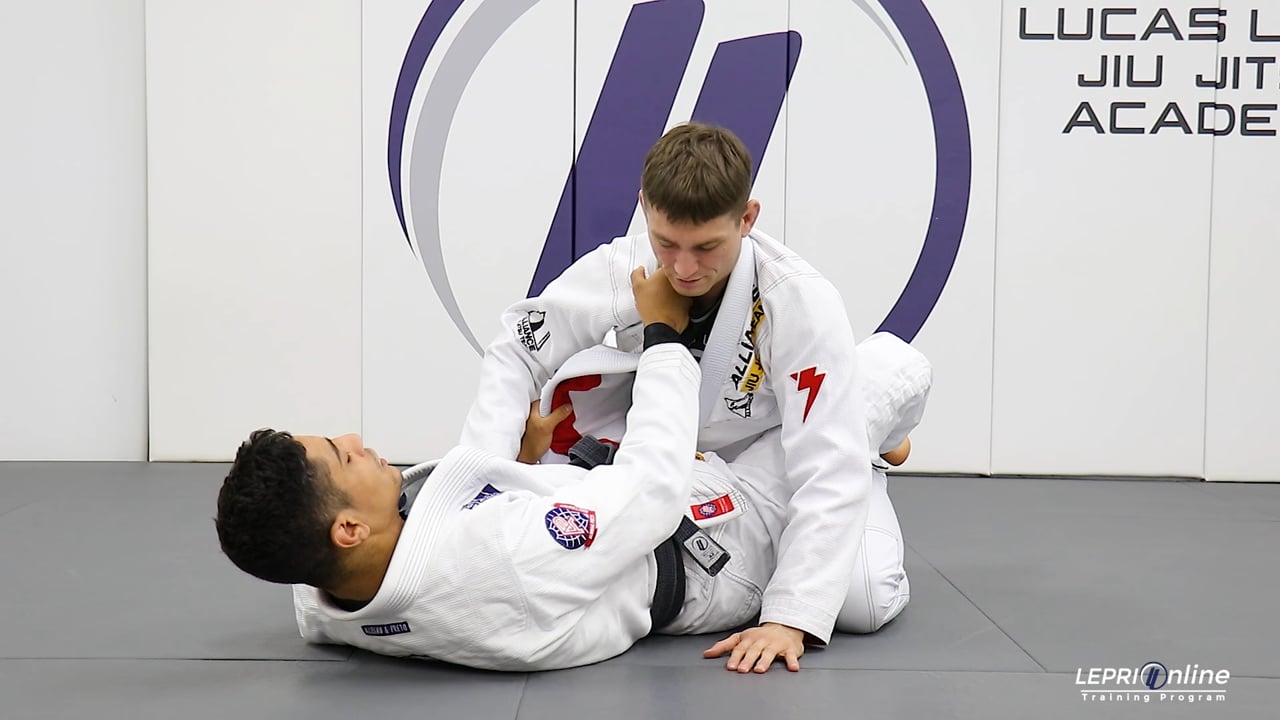 Professor Andre Gois teaches how to get the armbar submission from the closed guard, using the opponent’s lapel to trap the arm. Andre has the opponent in his closed guard and pulls the lapel out. He then brings the lapel over the opponent's arm and grips it with his opposite side hand. He uses his other hand to cross grip the collar. Andre starts to climb his legs up to set up the armbar. The grip on the collar is then released so it could be used to push the opponent’s head away. Andre now brings his leg over the head while still controlling the lapel to finish the armbar.