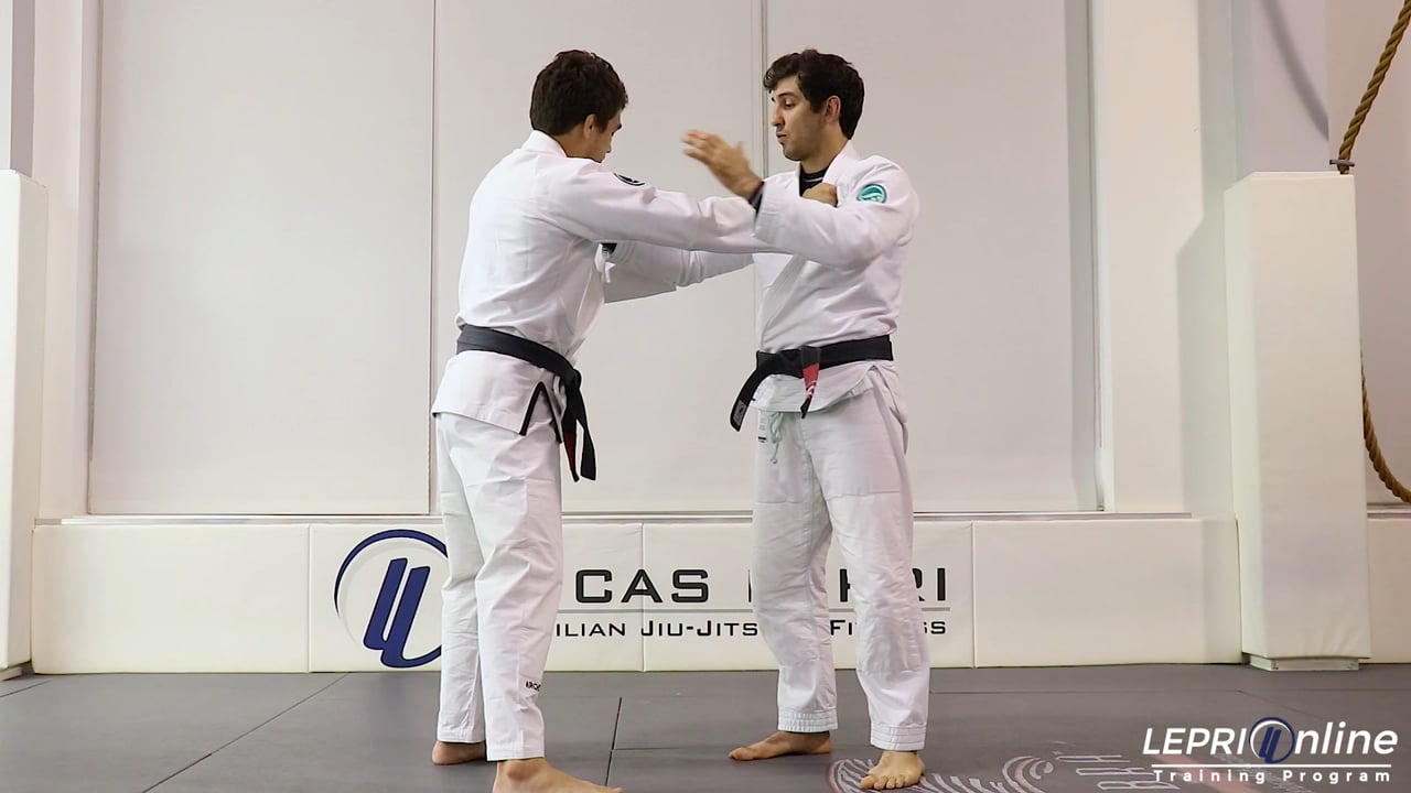 Professor Lucas Lepri shows how to get the armbar submission by getting the opponent to post as he pushes on the leg while standing. Lucas starts with one grip on the arm and the other on the collar. He steps to the side opposite to the collar grip. As he steps to the side, he places his opposite foot on the opponent’s same side leg. This makes the opponent base as Lucas starts to sit on the mat. As soon as Lucas hits the mat, he bring his outside leg over the opponent’s head and raises his hips. He then rolls with the opponent, coming on top and locking the armbar submission.