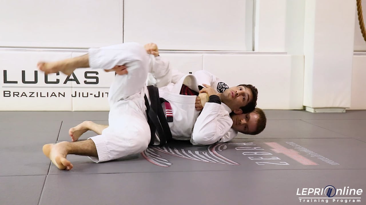 Professor Lucas Lepri shows a back take escape when in the turtle position. The opponent begins with one hook in and a seatbelt grip while Lucas is in the turtle position. Lucas protects his neck with one hand and uses the other hand on the knee of the opponent’s hook. Lucas rolls his opponent over the shoulder opposite the hook and uses his leg to stop the opponent from dragging him to the other side. Lucas places his head on the mat and switches his grips, gripping the material on the pants of the hook with the same-side hand and protecting his neck with the other hand. Lucas kicks his leg free of the hook, moves his body perpendicular to his opponent’s body, and bridges on top of the opponent. To prevent the opponent from retaking the back, Lucas turns his hips and uses his knee to block the opponent’s hips as he comes up to complete the transition to side control.