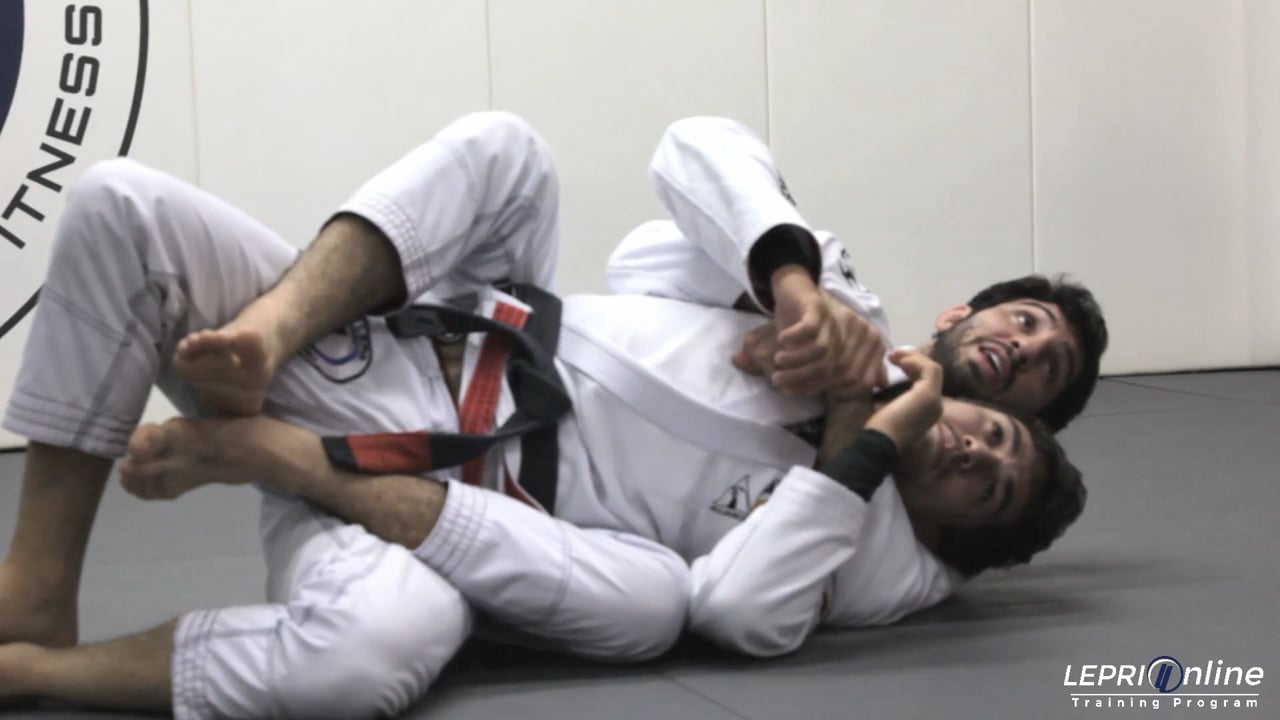 Professor Lucas Lepri teaches how to take the back and apply the bow and arrow choke when an opponent defends against the back take using a wing roll. Lucas starts with the seatbelt grip, but the opponent traps Lucas' arm and rolls to defend against the back take. Lucas maintains the seatbelt grip and passes one hook over the opponent's leg, using the other leg to elevate his hips and apply pressure. When Lucas releases the pressure he can easily roll the opponent back in the other direction and enter his second hook. Lucas then secures a collar grip, and when the opponent bridges to defend, Lucas grips the knee with his other hand, repositions his legs, and extends his body to apply the bow and arrow choke.