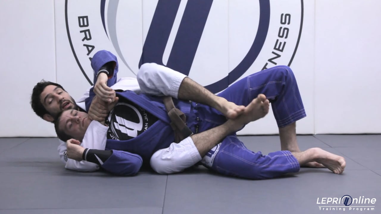 Professor Lucas Lepri demonstrates a headlock escape and back take from closed guard. When a novice opponent mistakenly tries to apply a headlock from inside the guard, Lucas uses the opportunity to take the back. As the opponent applies pressure with the headlock, Lucas grips the opponent's back or far lapel with his underhook hand and uses his leg on the other side to hook and push the opponent's leg. This allows Lucas to duck his head under the arm of the opponent and take his back.