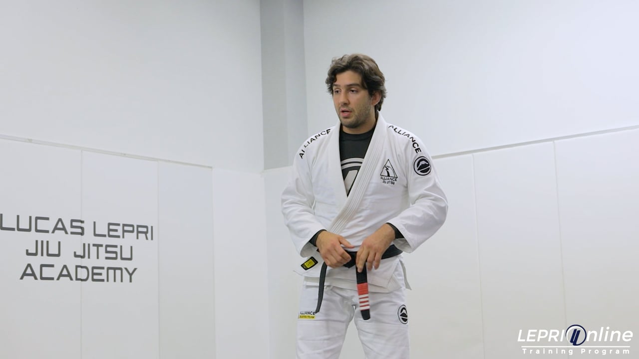 Professor Lucas Lepri teaches how to take the opponent’s back when they are in the turtle position. The opponent is in the turtle position and Lucas is on the side. Lucas moves back and places his chest on the opponent's lower back while keeping his knees bent. He reaches over the back and goes for the cross collar control with one hand. Lucas now drops the knee to the mat on the same side as the collar grip and uses his free hand to post on the mat. This post and grip allow Lucas to pull the opponent to the side, allowing him to make the opponent fall. If the opponent stays there, Lucas stays in the side control position. If the opponent attempts to roll away, then Lucas takes the opponent’s back control.